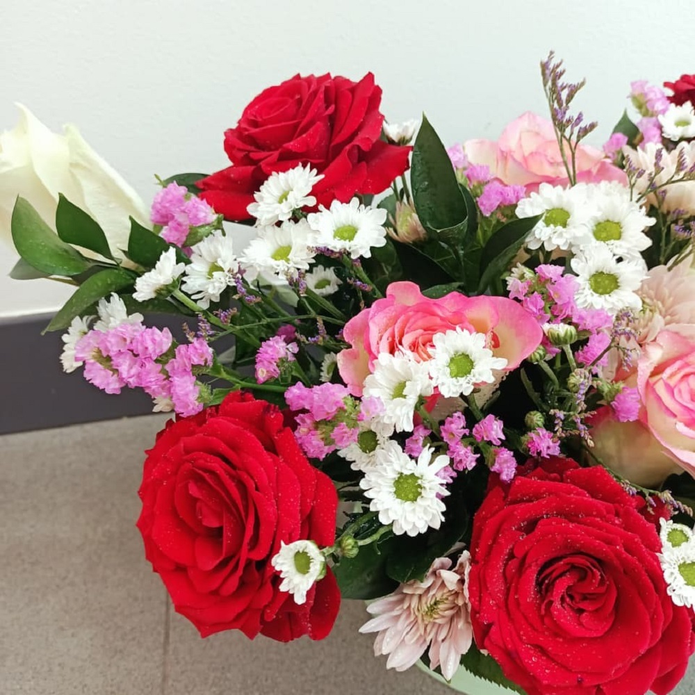 A lively, traditional arrangement presented in a stylish, round mint-green hatbox. It features a stunning mix of bold red and creamy white roses, soft pink baby roses and chrysanthemums, and white daisies, perfect for a festive anniversary or celebration.