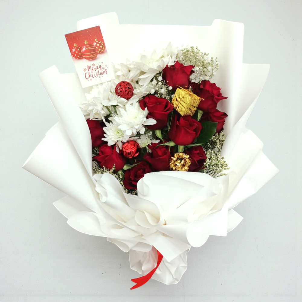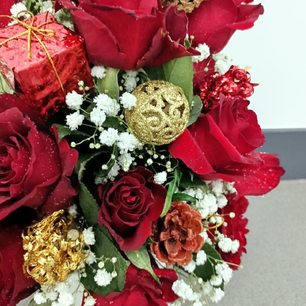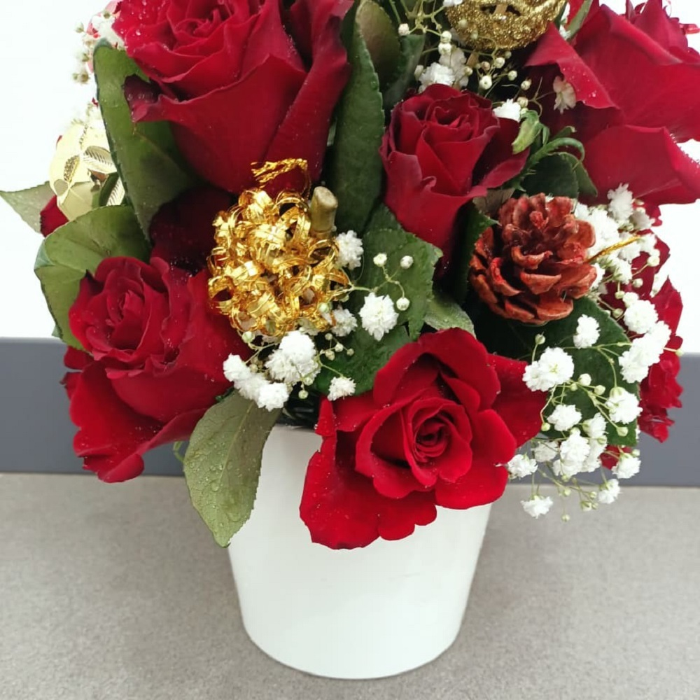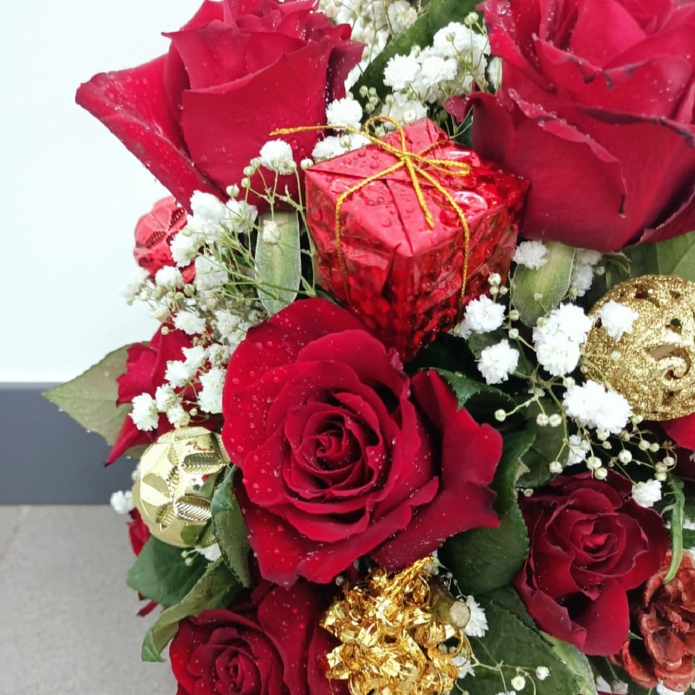 A luxurious, cone shaped arrangement of velvety red roses and delicate white gypsophila (baby's breath) that evokes a snowy winter forest, this tabletop centerpiece is richly adorned with gilded pinecones, sparkling gold ornaments, and a miniature red gift box, all perfectly balanced in a minimalist white vase for a sophisticated holiday look.