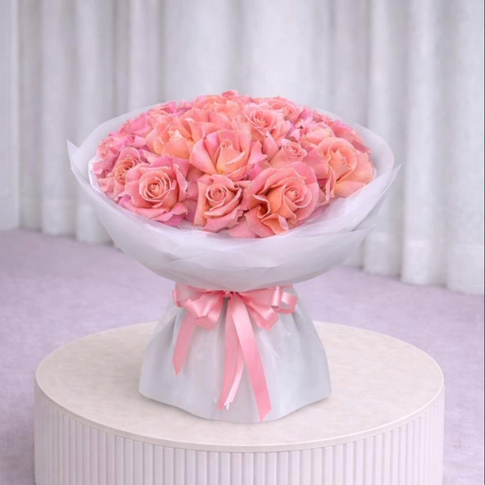 A beautiful bouquet of 25 Hermosa roses, elegantly wrapped in white tissue and transparent paper, finished with pink ribbons.