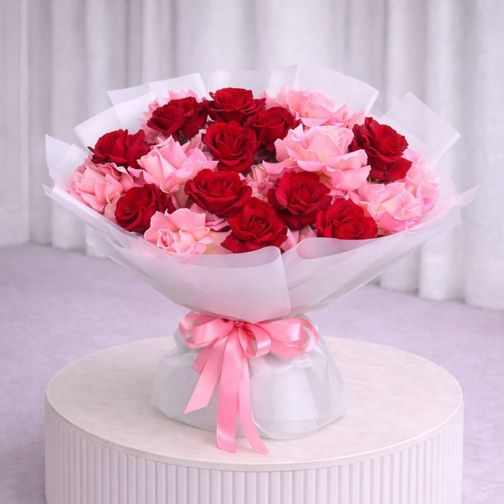 A stunning bouquet featuring 25 Hermosa roses and 10 red roses, elegantly wrapped in white transparent paper and finished with pink ribbons.