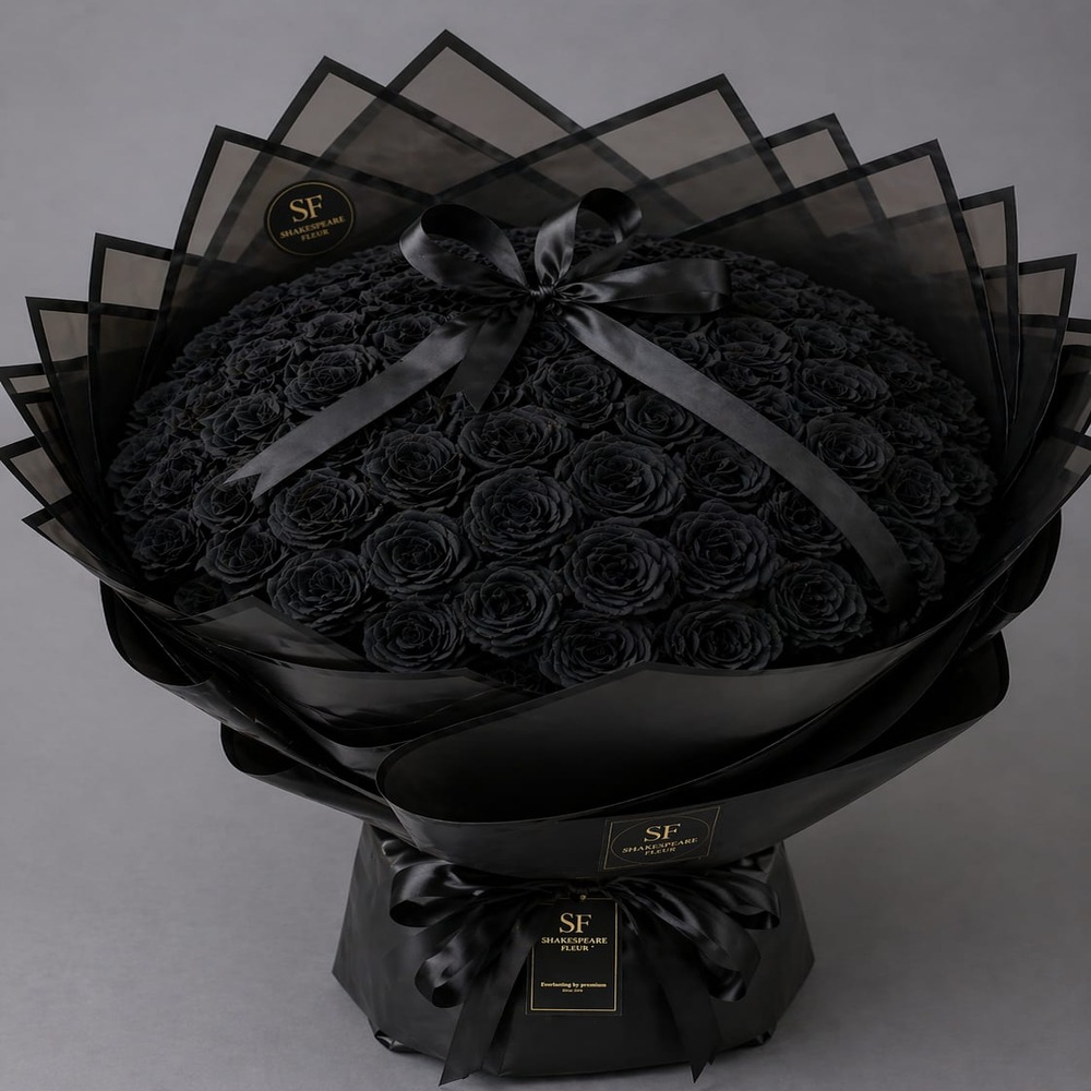 A hand bouquet containing 100 black roses, arranged beautifully.