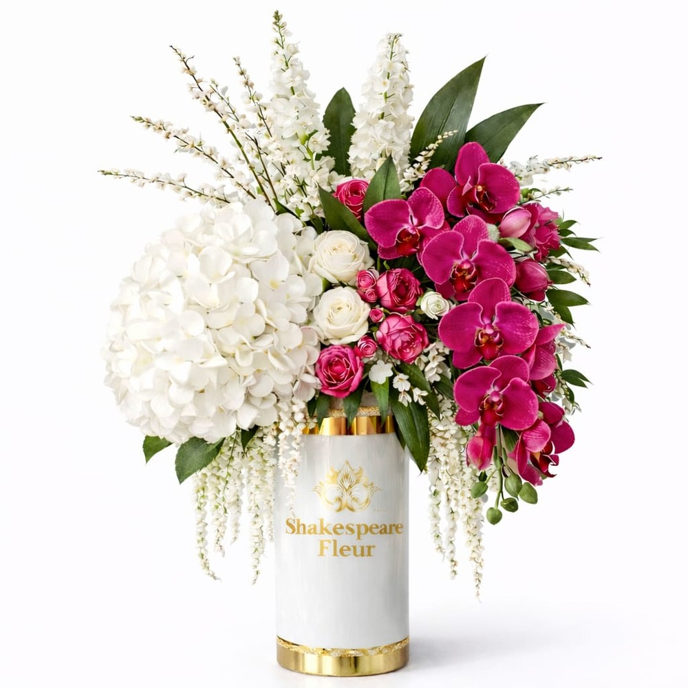 A luxurious floral arrangement designed to express elegance and softness. This premium vase features a harmonious blend of pink orchids, white hydrangeas, and delicate roses, enhanced with cascading flowers for a graceful and sophisticated look. Perfect for: VIP Gifts Weddings & Engagements Luxury Home Decoration Special Occasions.