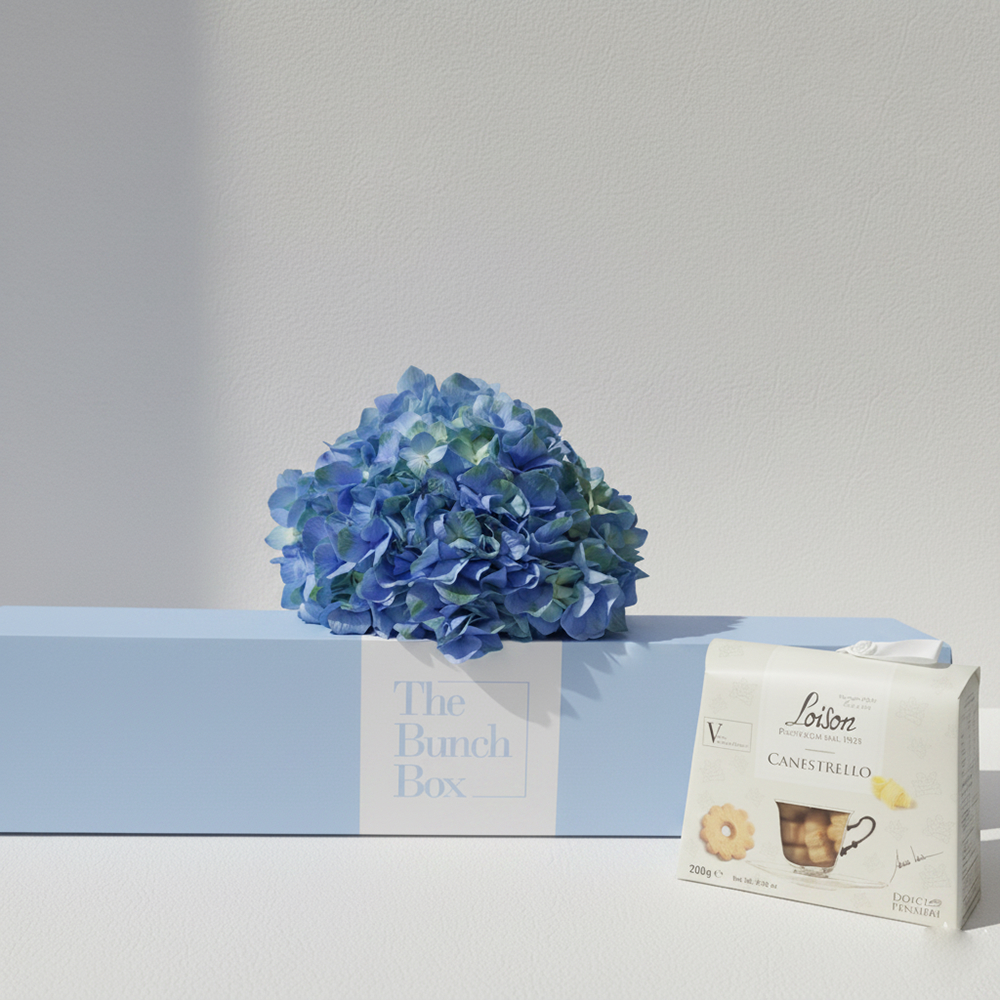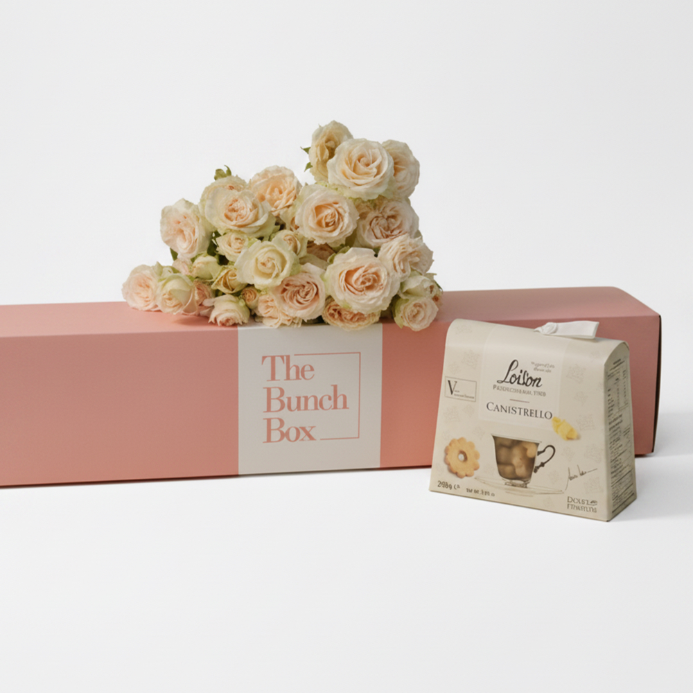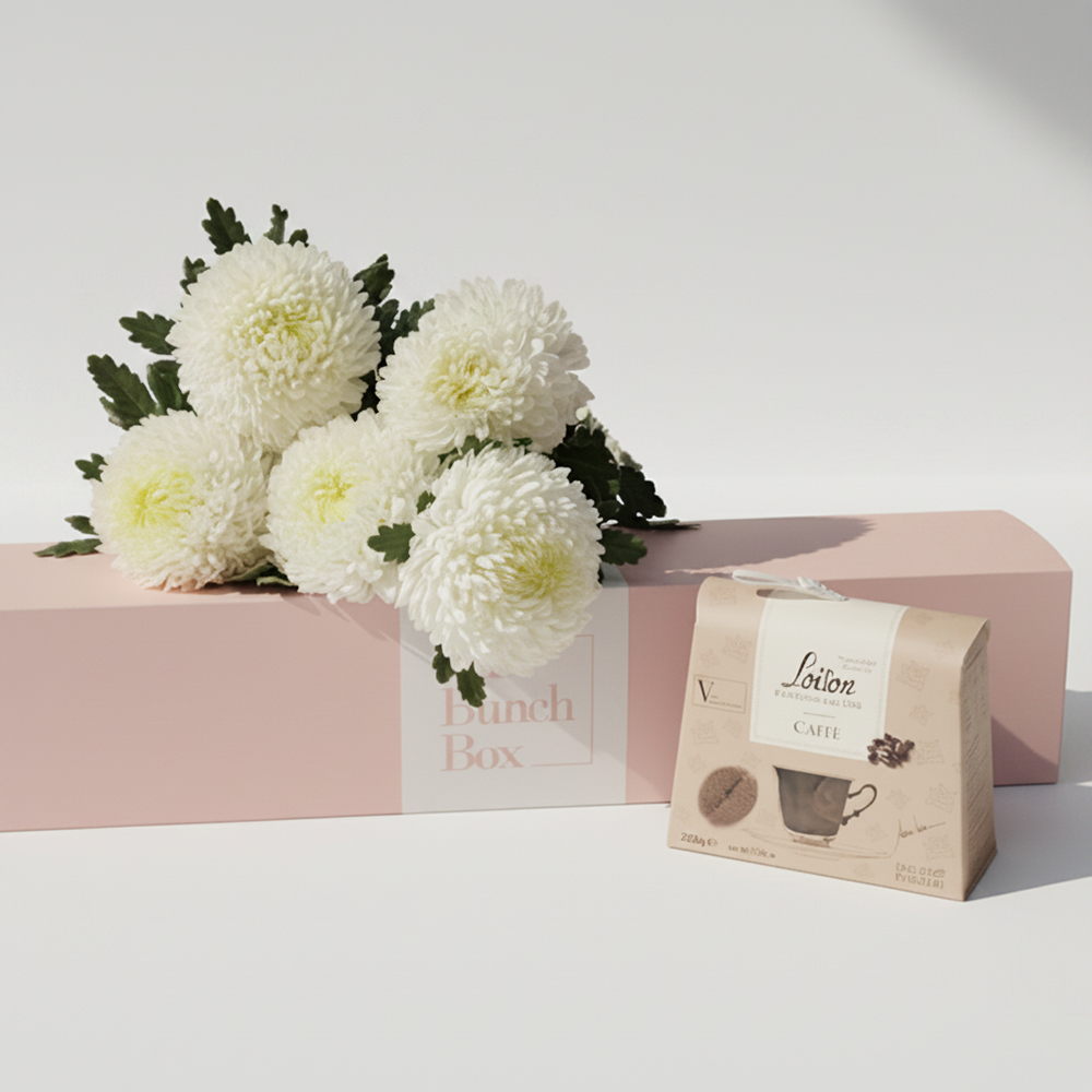 A box featuring 5 white chrysanthemums with 200g Loison Caffe biscuits.