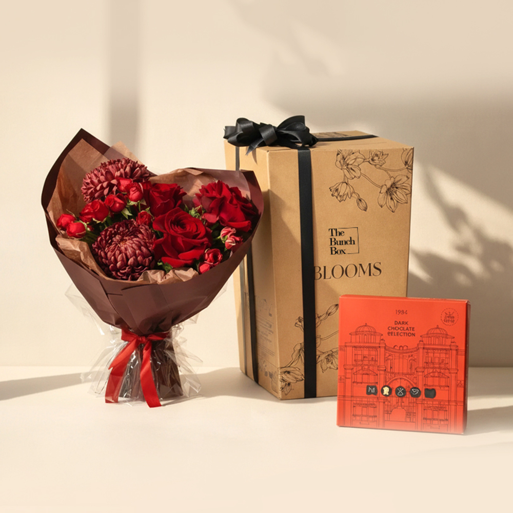 This high-fashion gift set pairs vivid roses, baby roses, and chrysanthemums with a premium selection of dark chocolate. Encased in espresso-toned structural wrap and our signature branded gift box, it is a sophisticated choice for an unforgettable love gesture.