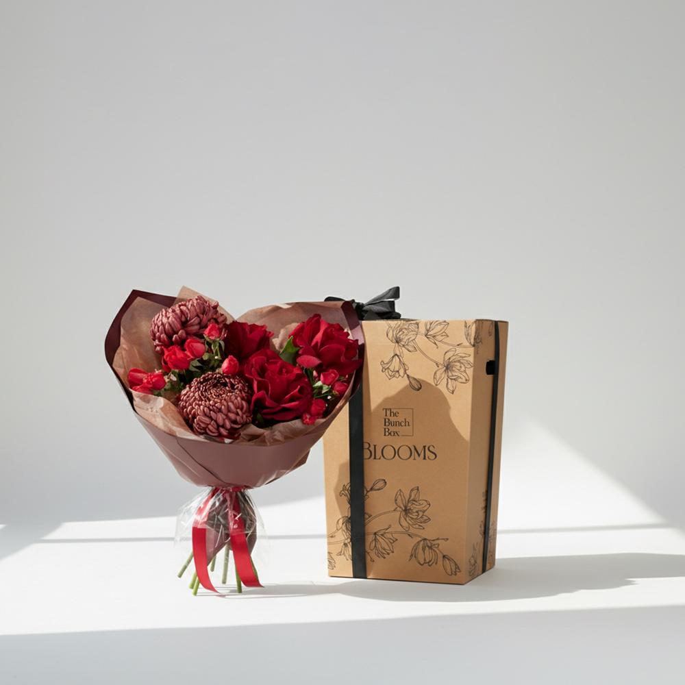 This sophisticated bouquet pairs vivid red roses with deep maroon chrysanthemums for a striking, modern look. Encased in 6 layers of designer wrap and our signature branded gift box, it is the ultimate statement for a bold and sultry Love Day.