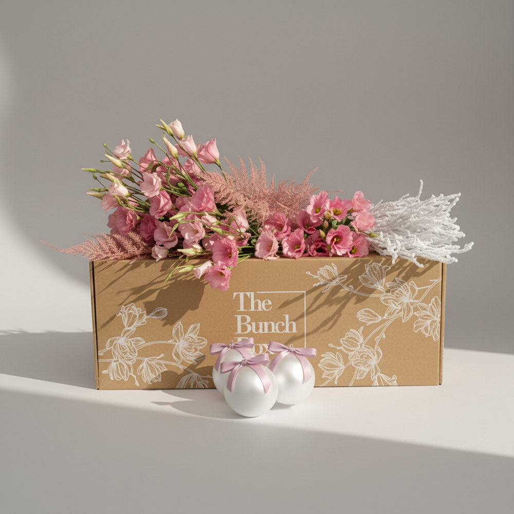 An elegant bouquet featuring lisianthus flowers in blush, frosted betula branches, and asparagus foliage in bronze, with decorative ornaments and complimentary flower food for lasting elegance.
