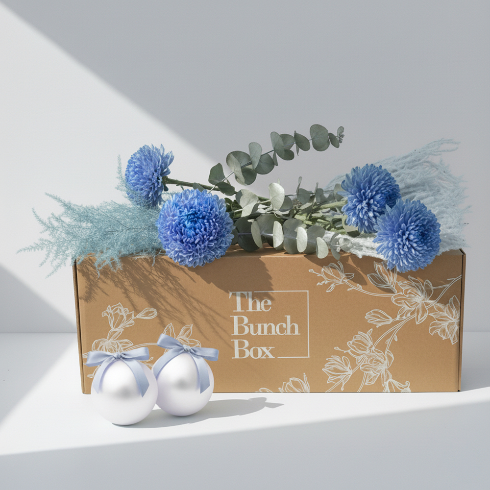 An elegant bouquet featuring asparagus foliage and chrysanthemum flowers in blue, with birch accents and festive ornaments, complete with complimentary flower food for lasting holiday freshness.