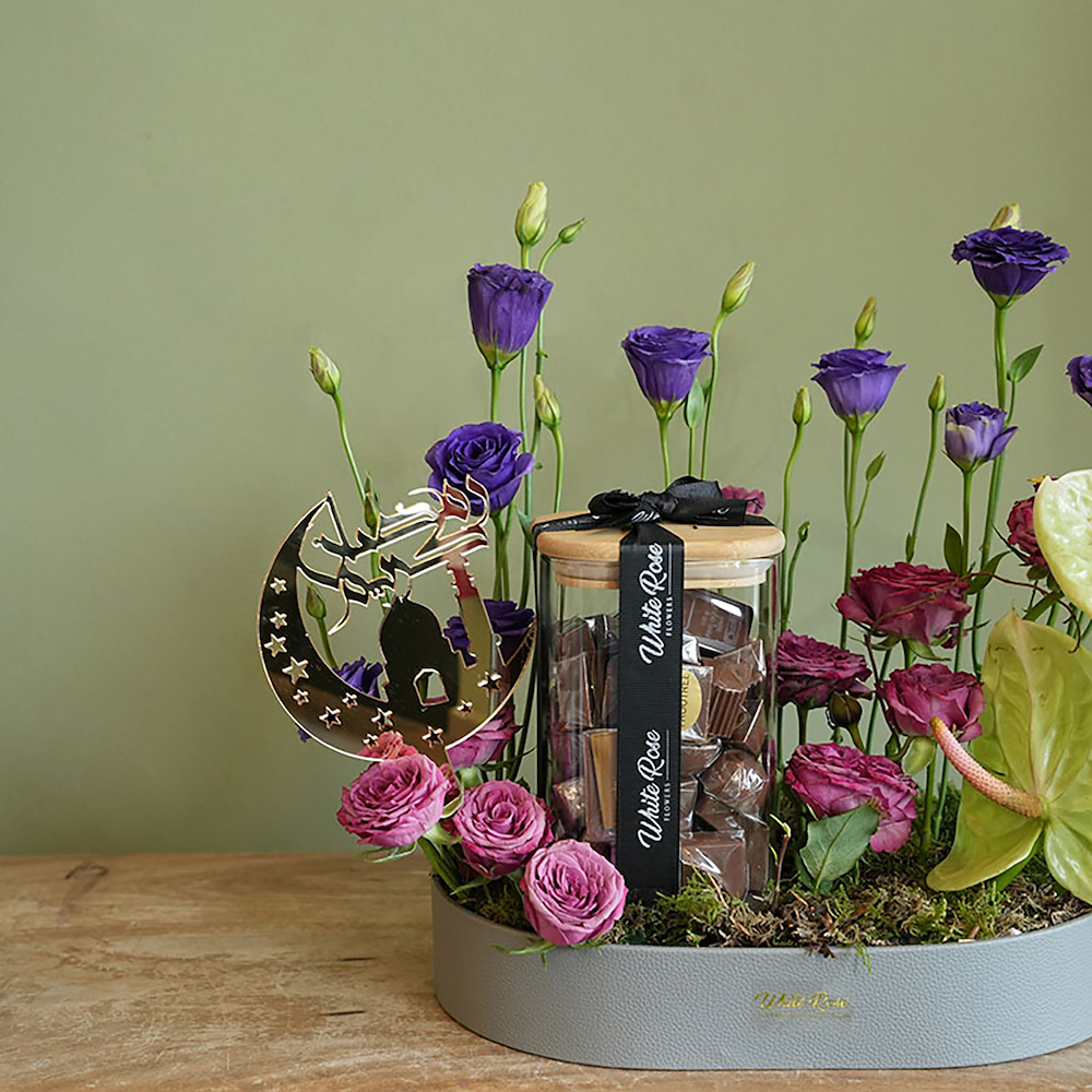 A bouquet containing roses and anthuriums with 600g of chocolates arranged beautifully in a wooden tray.