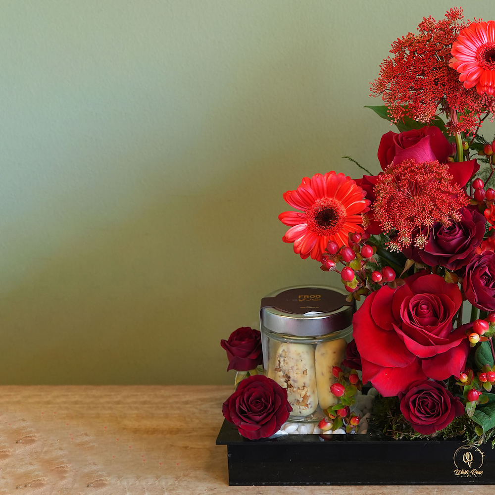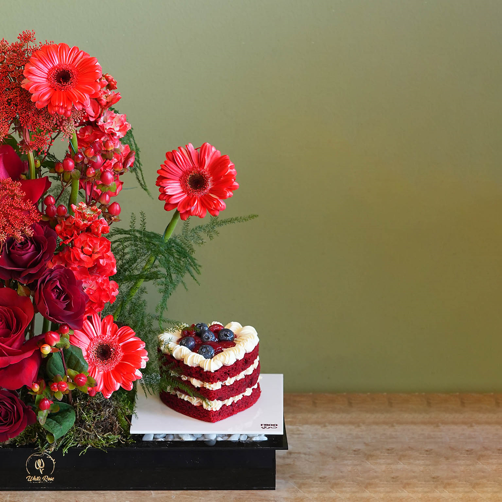 A bouquet containing roses, baby roses, and gerberas, arranged beautifully in a tray with a 300g cake and 250g of chocolates.