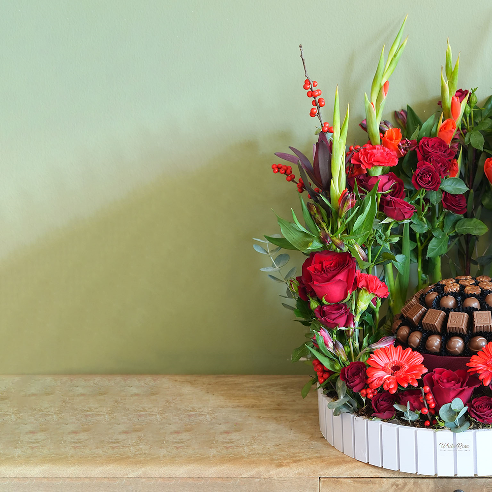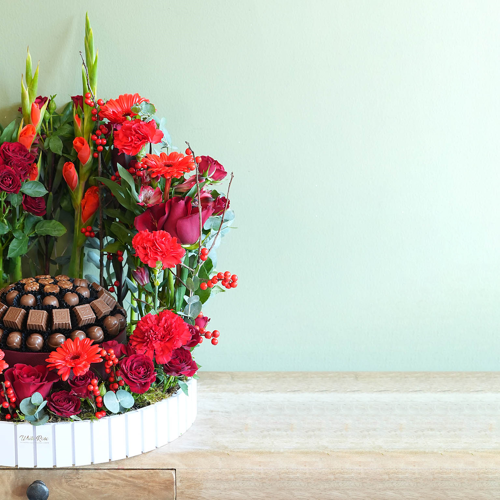 A bouquet containing baby roses, gerberas, and carnations, arranged beautifully in a wooden tray with 800g of chocolates.