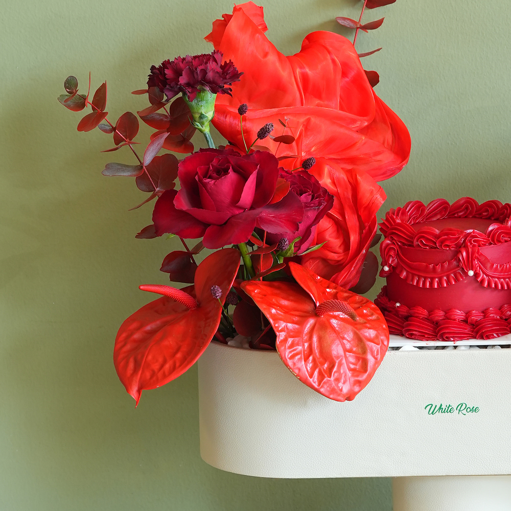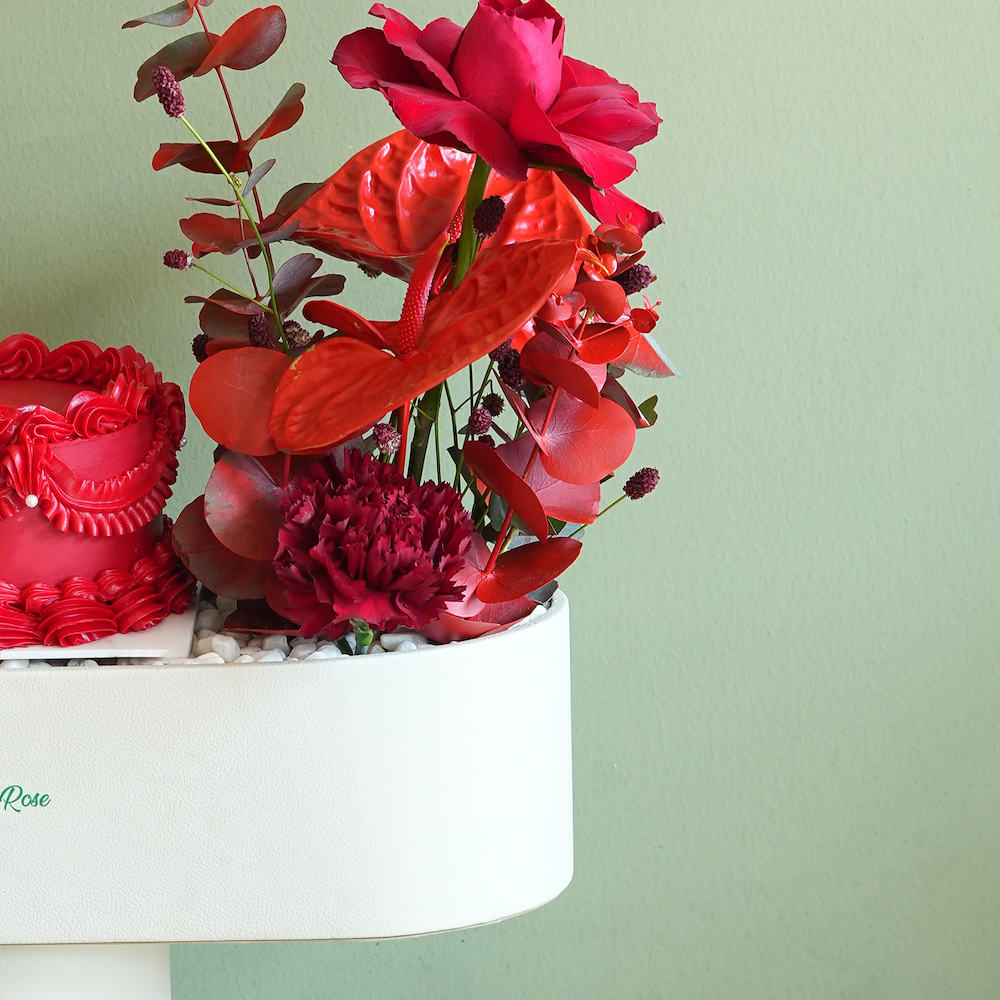 A bouquet containing roses, gerberas, and carnations, arranged beautifully in an acrylic stand with a 300g cake.
