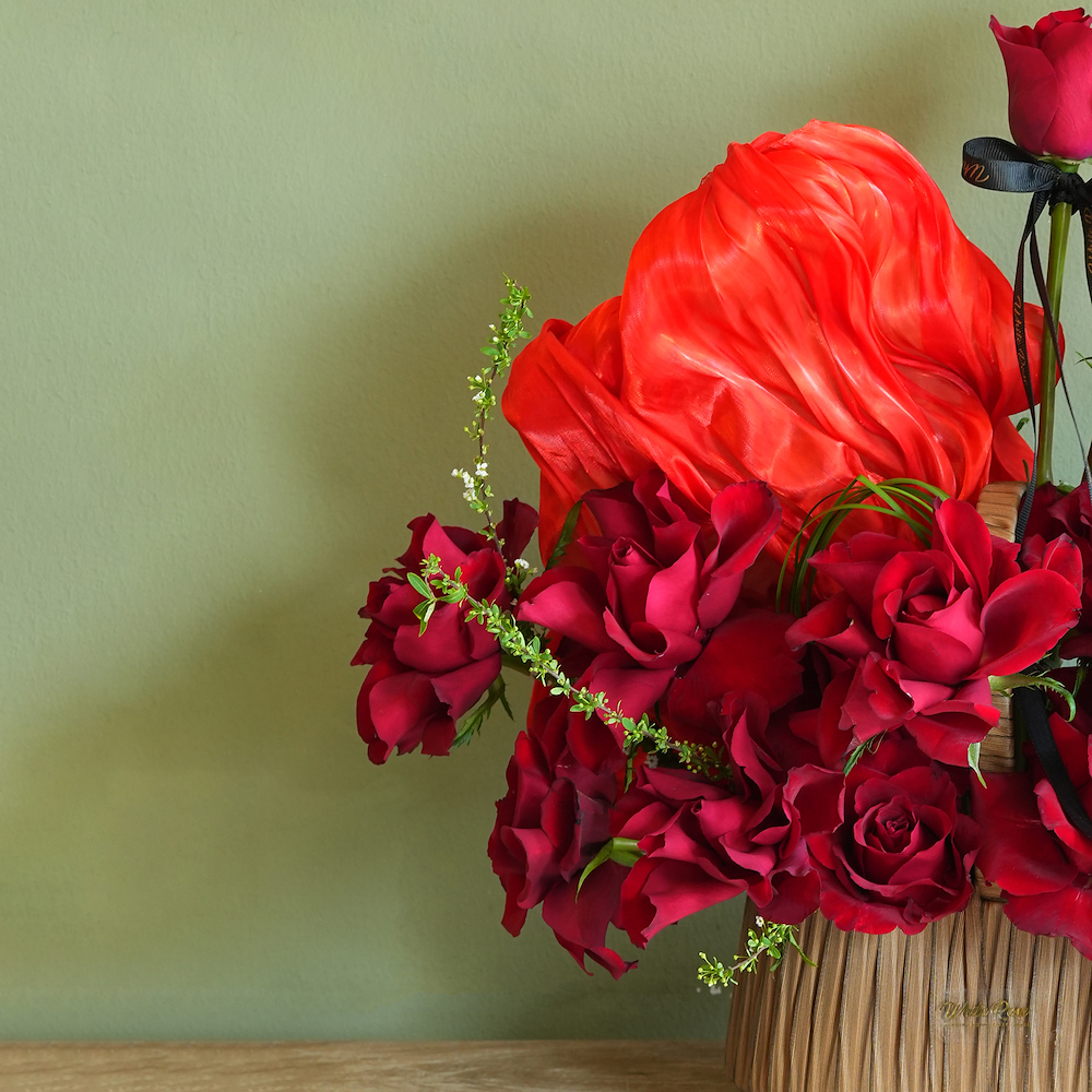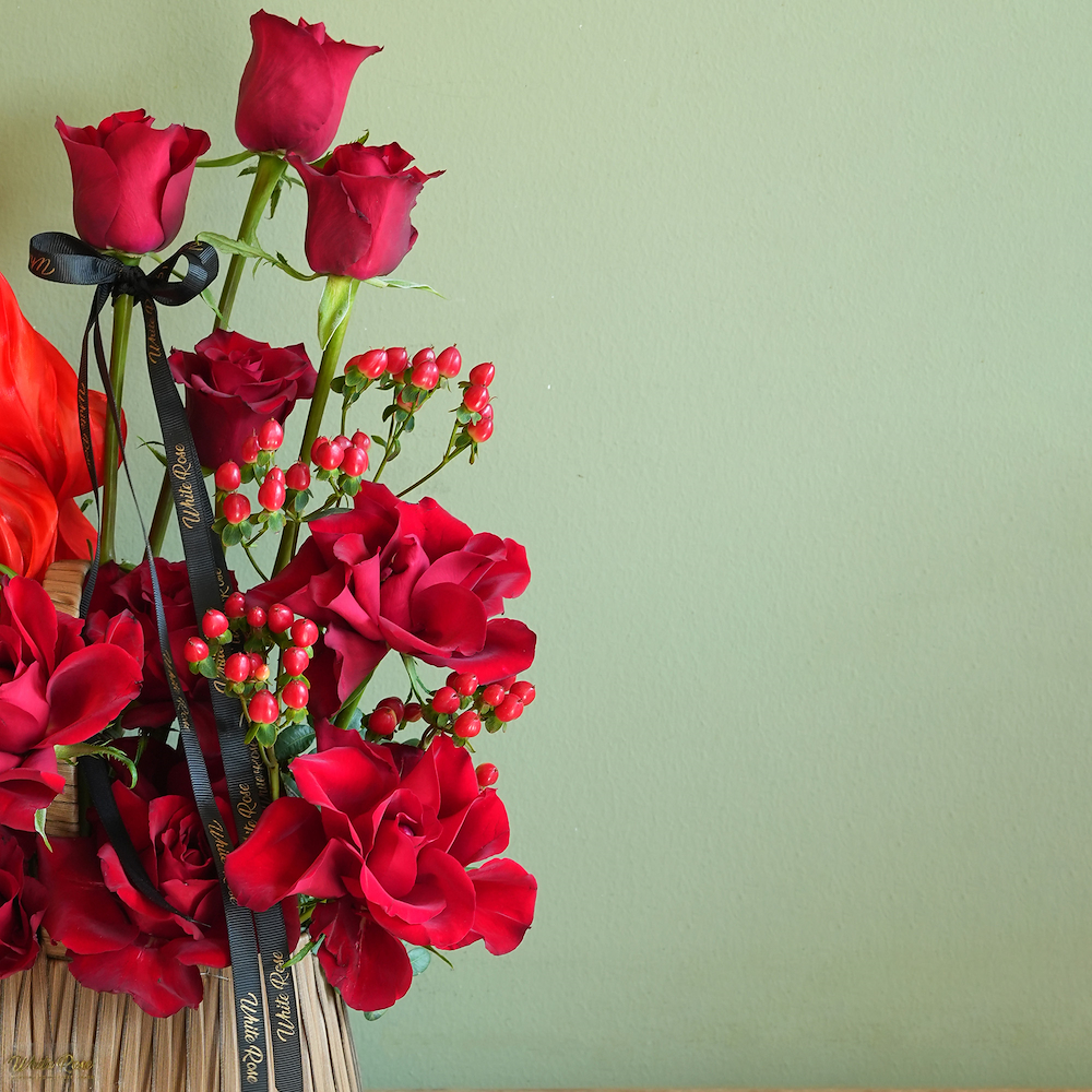 A bouquet containing roses and baby roses, arranged beautifully in a basket.