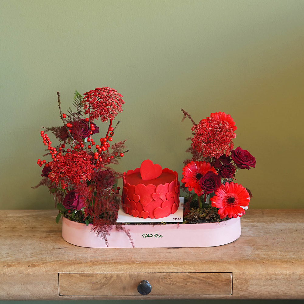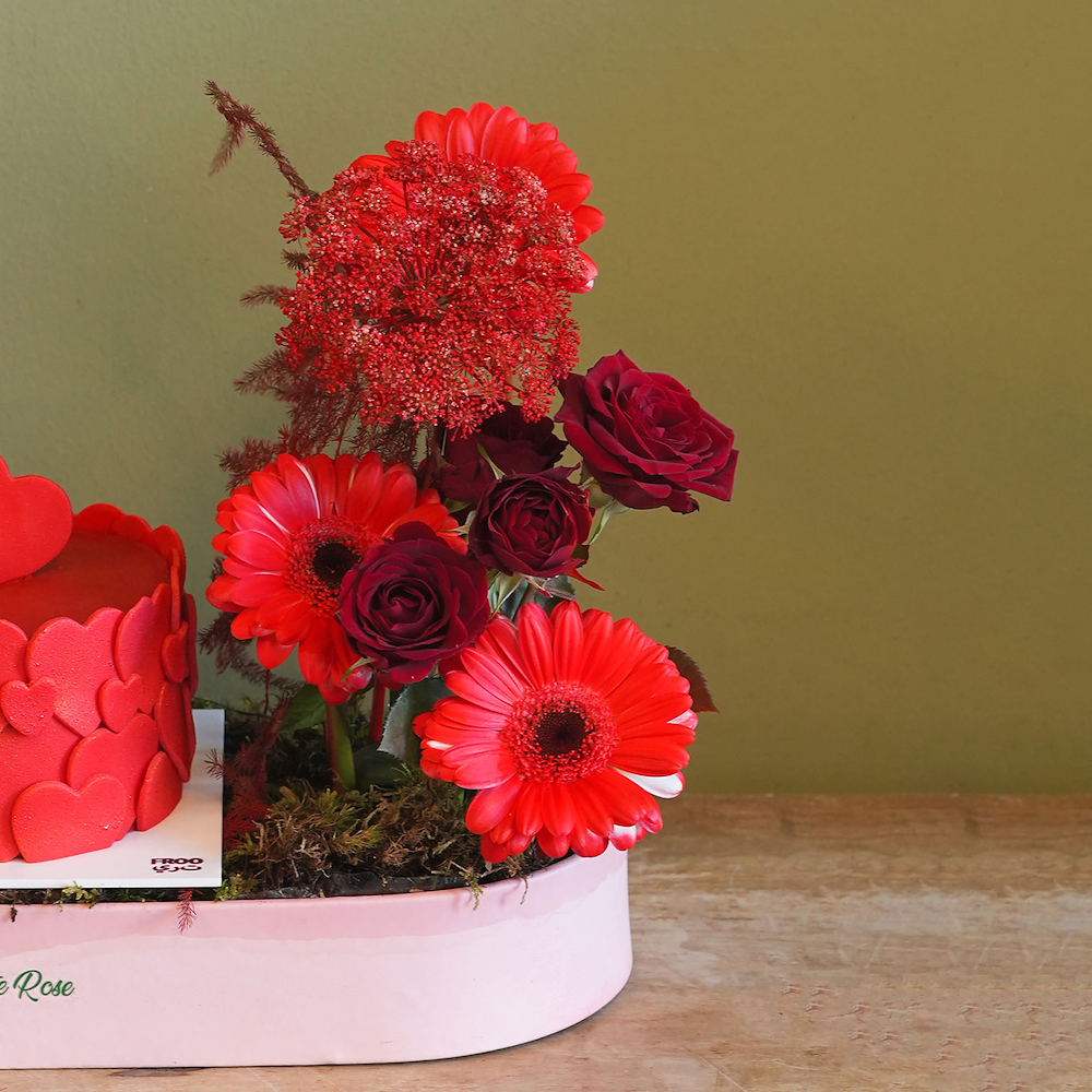 A bouquet containing roses, baby roses, and gerberas, arranged beautifully in a tray with a 300g cake.