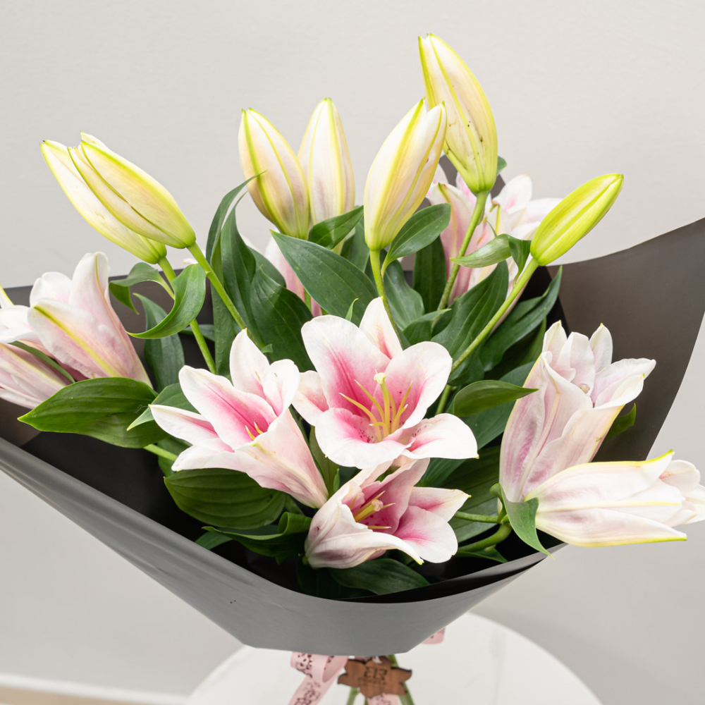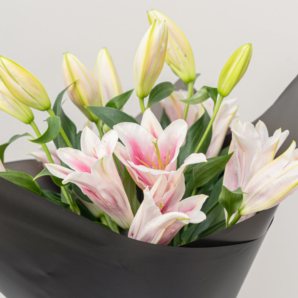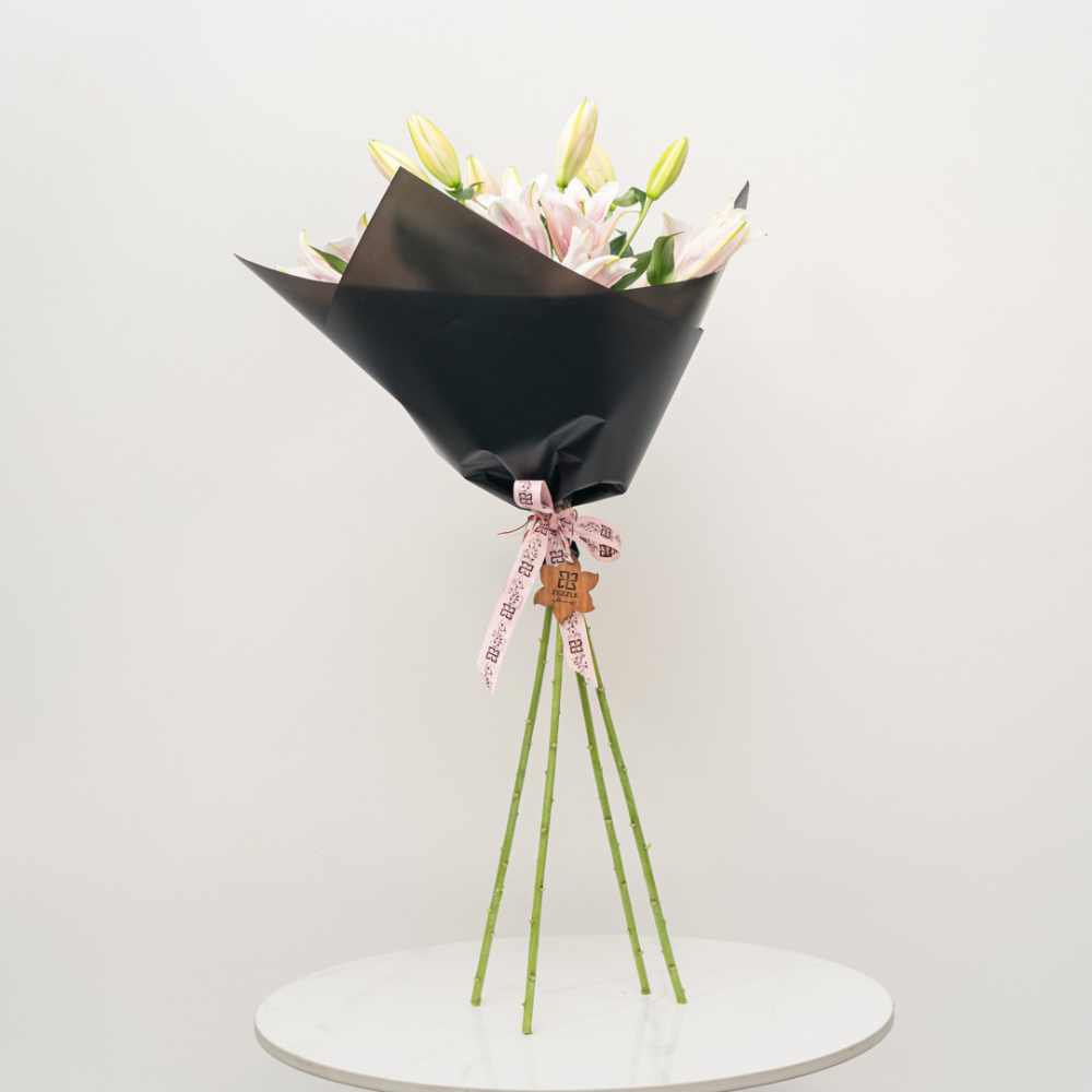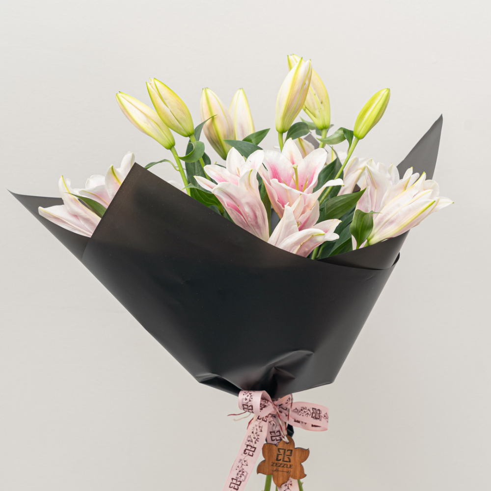 A graceful bouquet of four soft pink lilies, beautifully wrapped in luxurious black paper. The contrast between the delicate pink blooms and the bold black wrapping creates a striking expression of elegance, sophistication, and timeless charm perfect for meaningful moments and refined tastes.