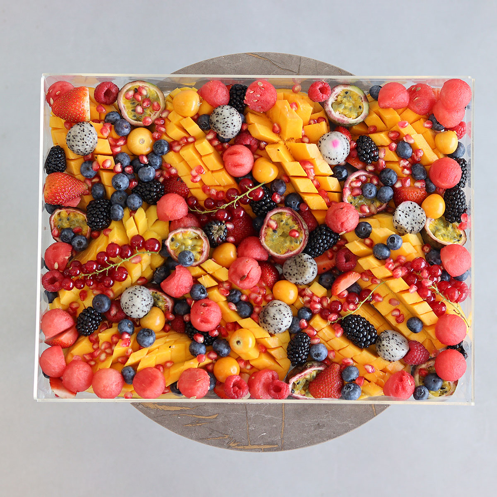 مزيج من الفواكه المقطعة، بما في ذلك المانجو، التوت الذهبي، البطيخ، فاكهة التنين، فاكهة العاطفة، التوت الأسود، التوت الأزرق، التيار الأحمر ومزيج آخر من الفواكه مرتبة في صينية أكريليك.