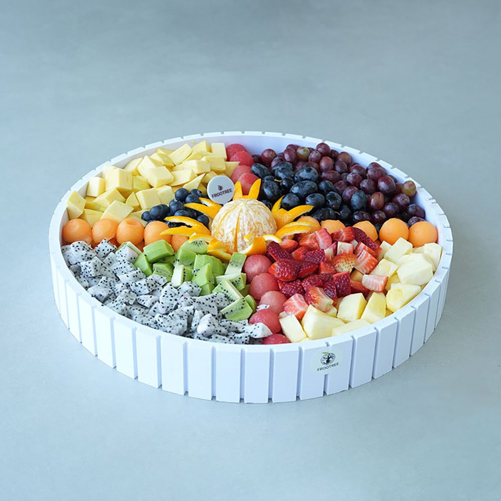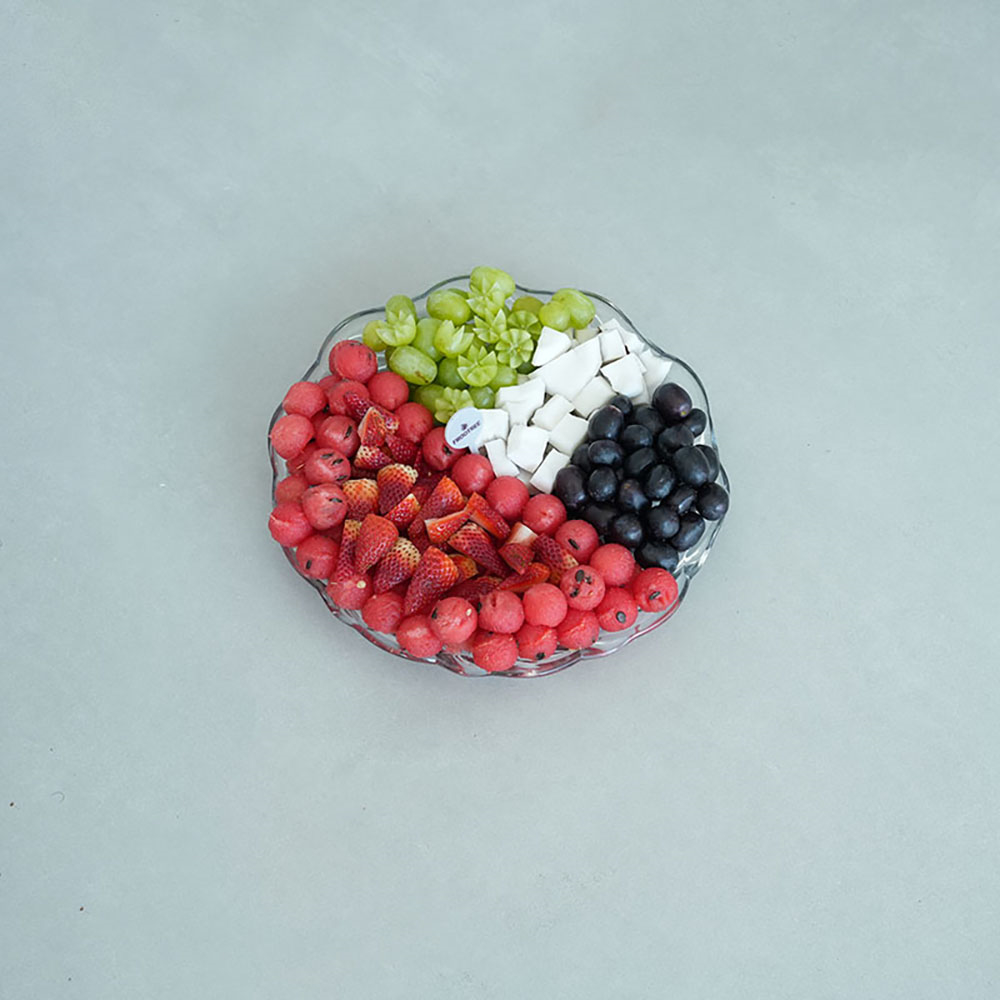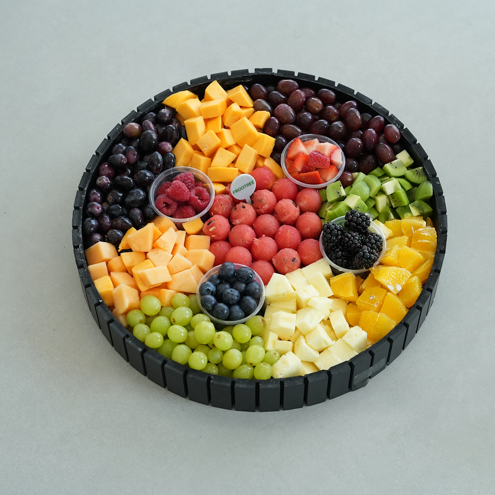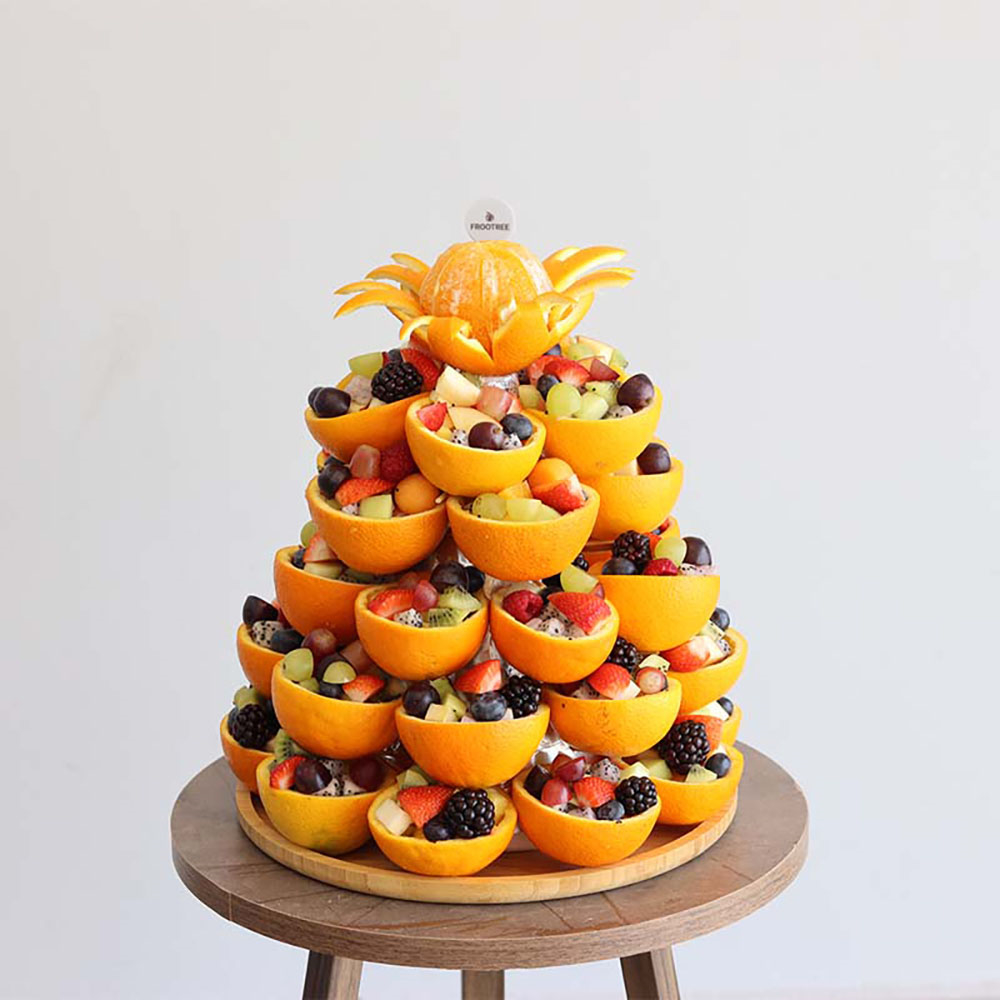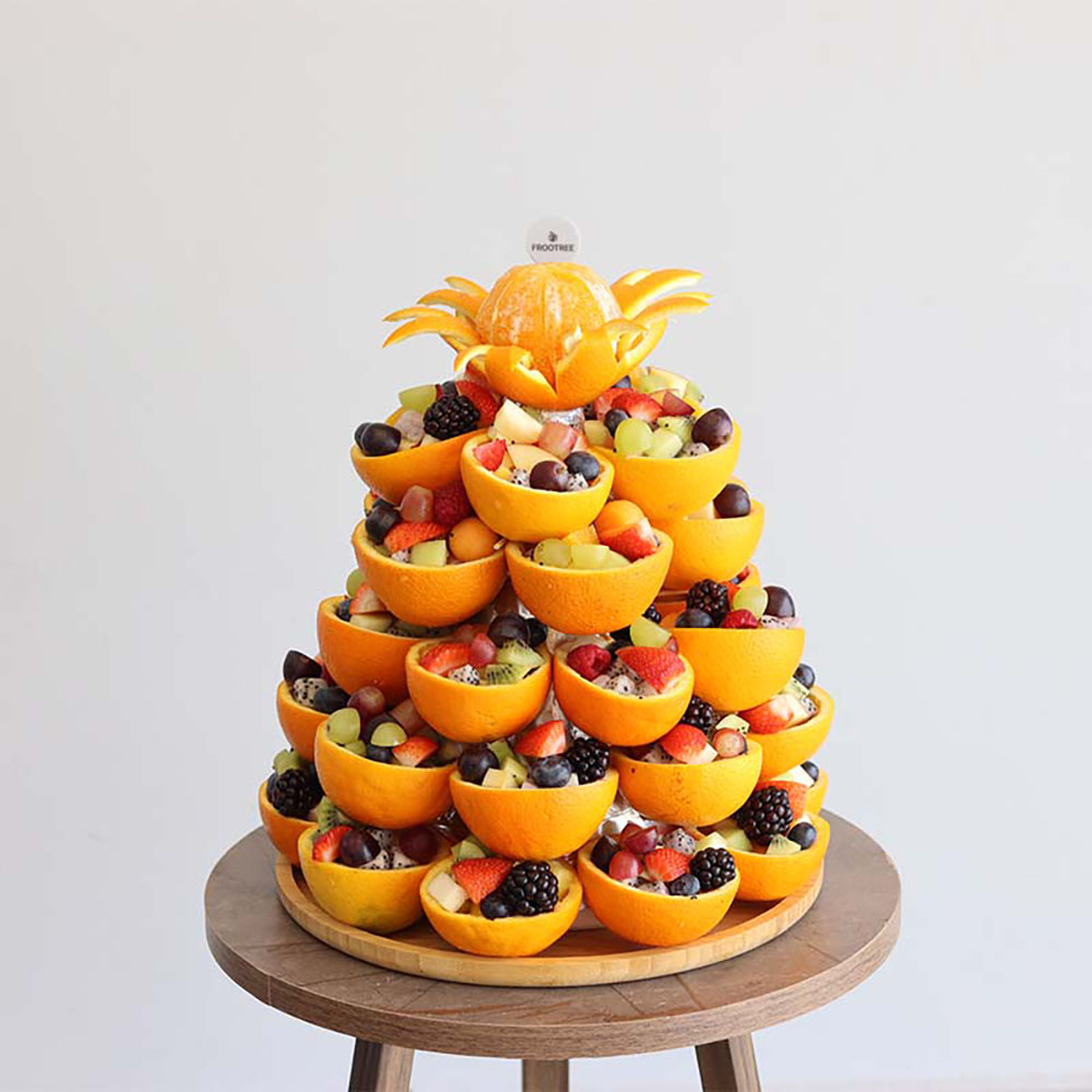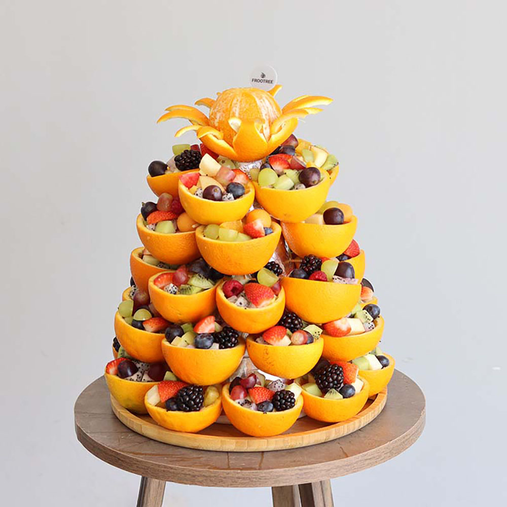 مزيج من الفواكه المقطعة، بما في ذلك الفراولة والكيوي والعنب والتوت والتوت والبطيخ وفاكهة التنين والأناناس والجوافة والتوت الأسود والتفاح ومزيج آخر من الفواكه مرتبة في كوب برتقالي.