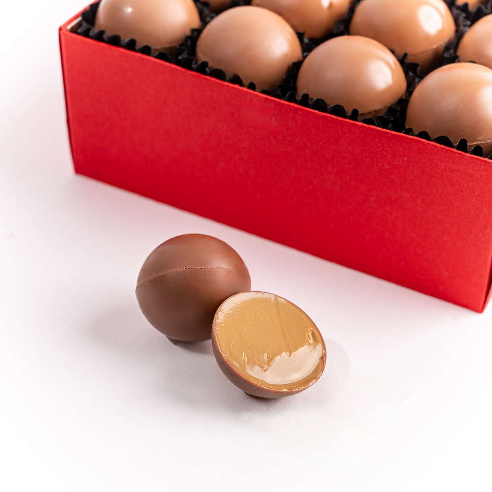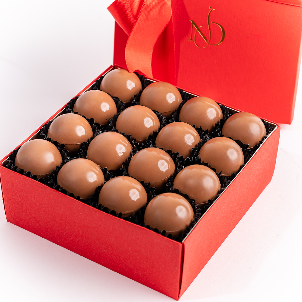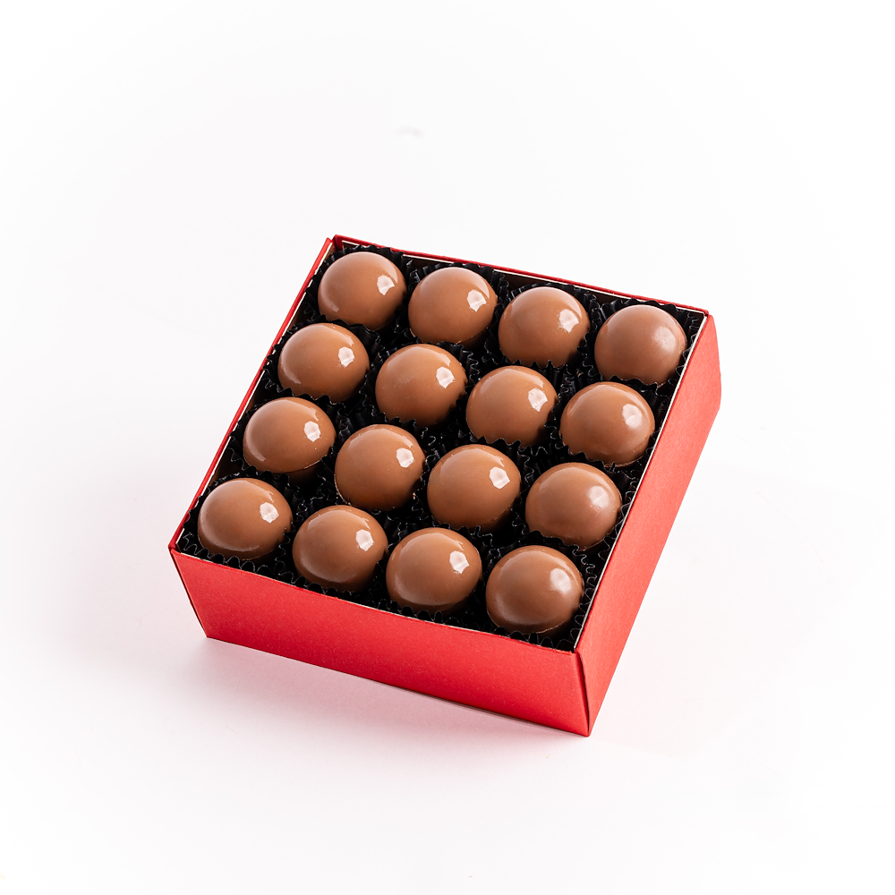بوكس يحتوي على 16 قطعة ترافل شوكولاتة بالحليب متنوعة، مقدم داخل بوكس أحمر أنيق، ليكون خيارا غنيا وفاخرا.