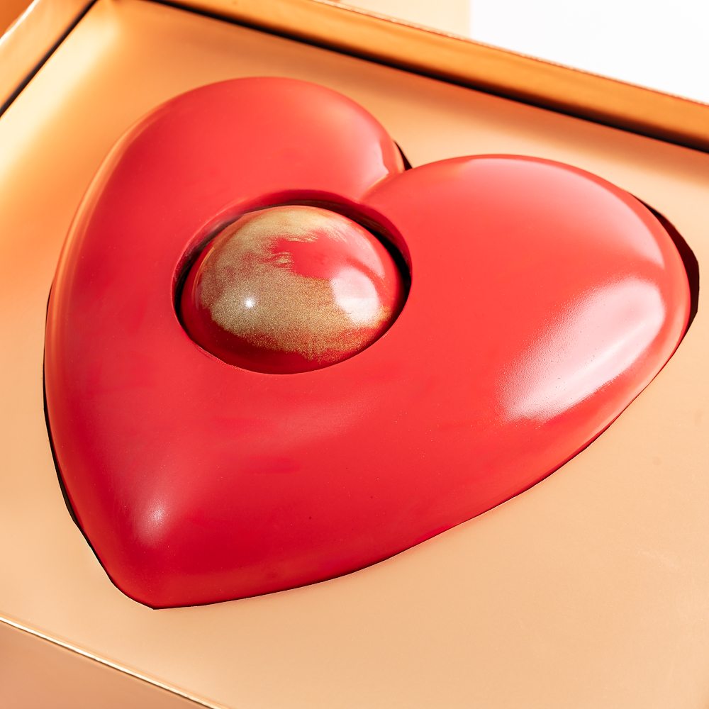 قلب شوكولاتة بالحليب ثلاثي الأبعاد بوزن 450غ، مزين بلمسات من الشوكولاتة البيضاء، ويحتوي في الداخل على كرة شوكولاتة ساخنة، مقدم داخل بوكس ذهبي مع شريط أنيق، ليكون هدية فاخرة وتجربة مميزة.