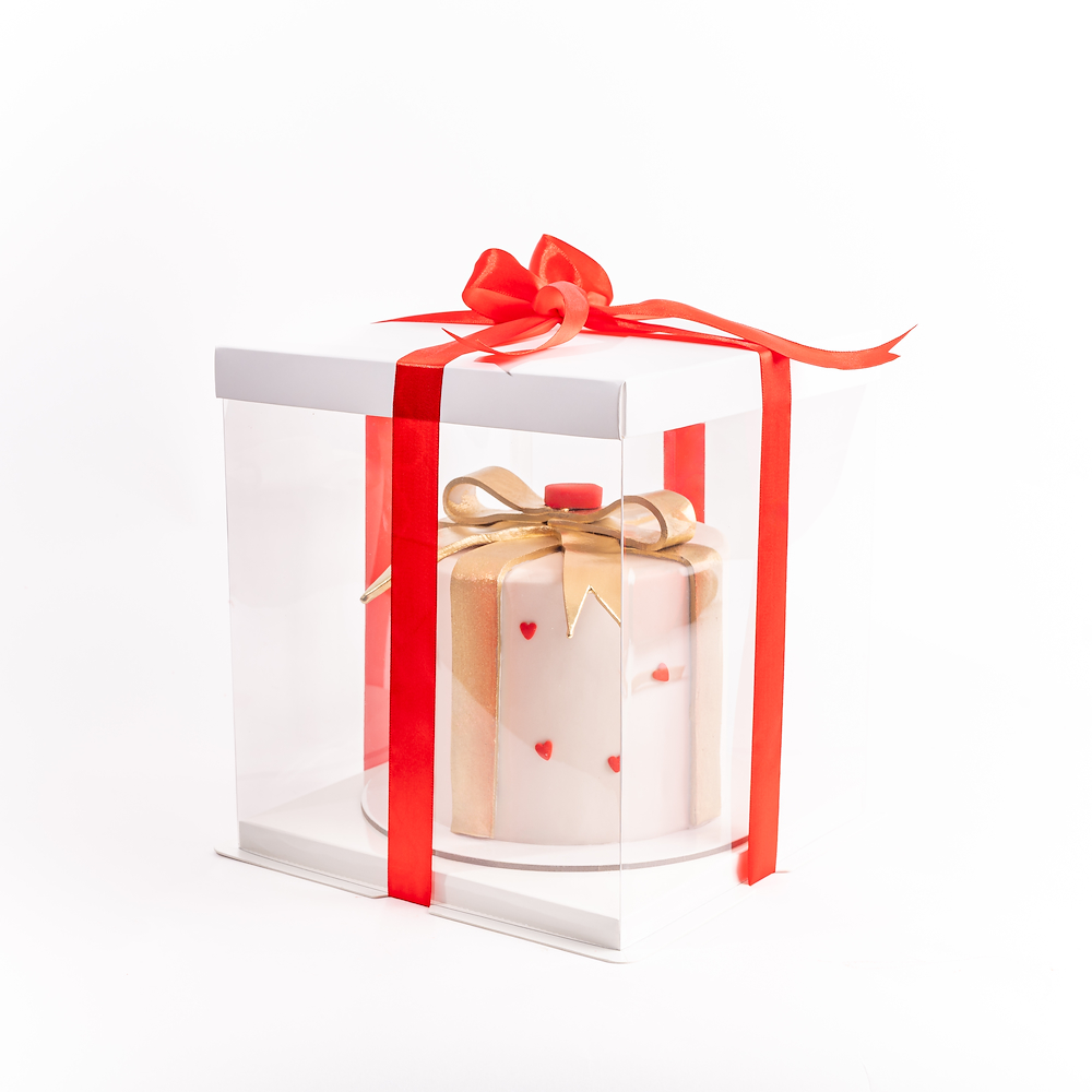 كيكة 1 كيلو، بطعم الشوكولاتة أو الفانيلا أو الريد فيلفت، بتغطية فوندان بلون وردي فاتح، ومزينة بشريط ذهبي صالح للأكل مع لمسات قلوب حمراء أنيقة، لتكون هدية فاخرة ومميزة لمناسباتك.