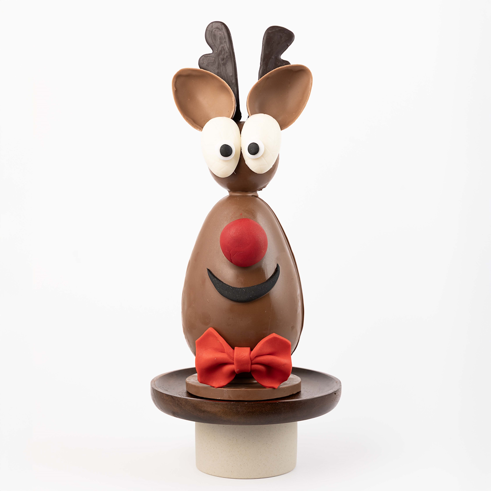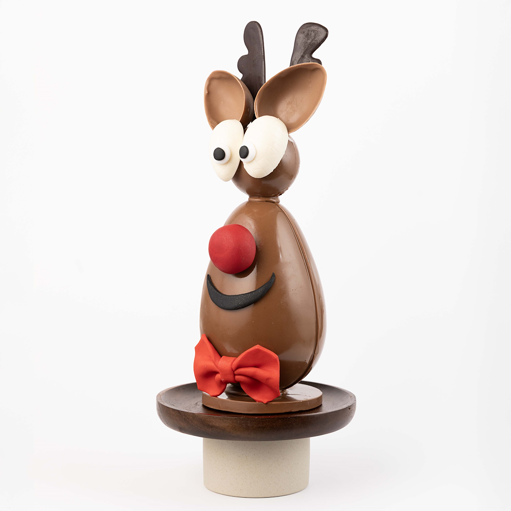 قطعة شوكولاتة بلجيكية بالحليب والبيضاء مصنوعة يدويا بوزن 430غ بتصميم رودولف المرح مع انف احمر وربطة عنق قابلة للاكل بالكامل ومثالية للهدايا الحلويات.