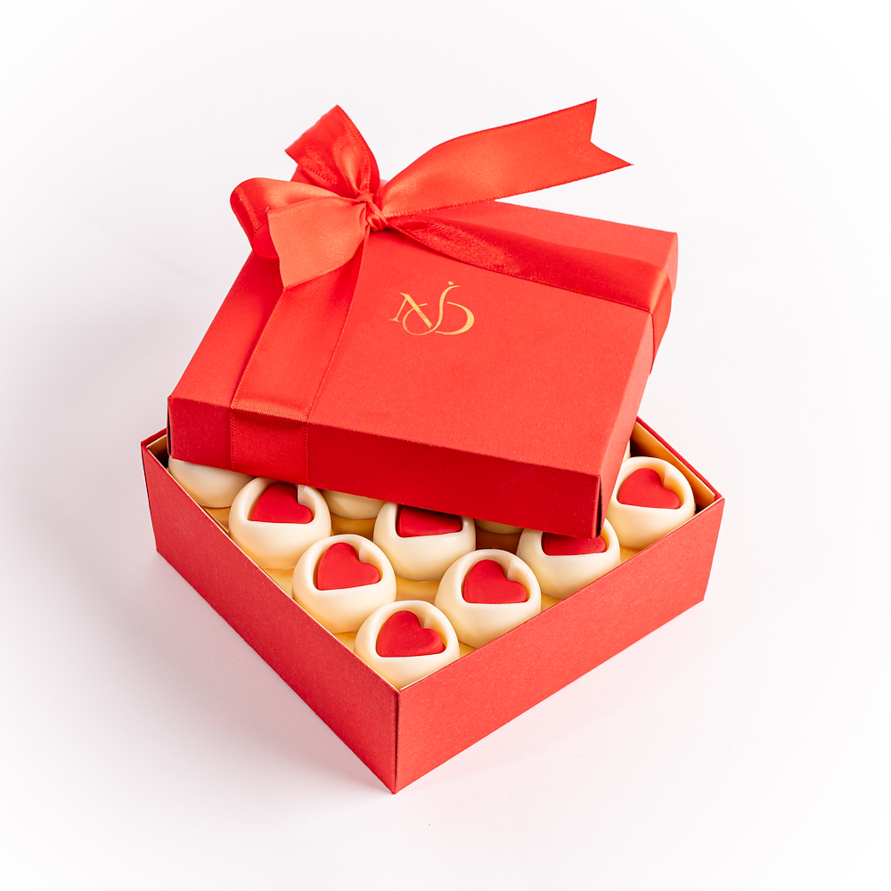 بوكس يحتوي على 16 قطعة شوكولاتة على شكل قلب باللونين الأحمر والأبيض بتصميم متناوب، بوزن تقريبي 192غ، لتكون هدية رومانسية مميزة.