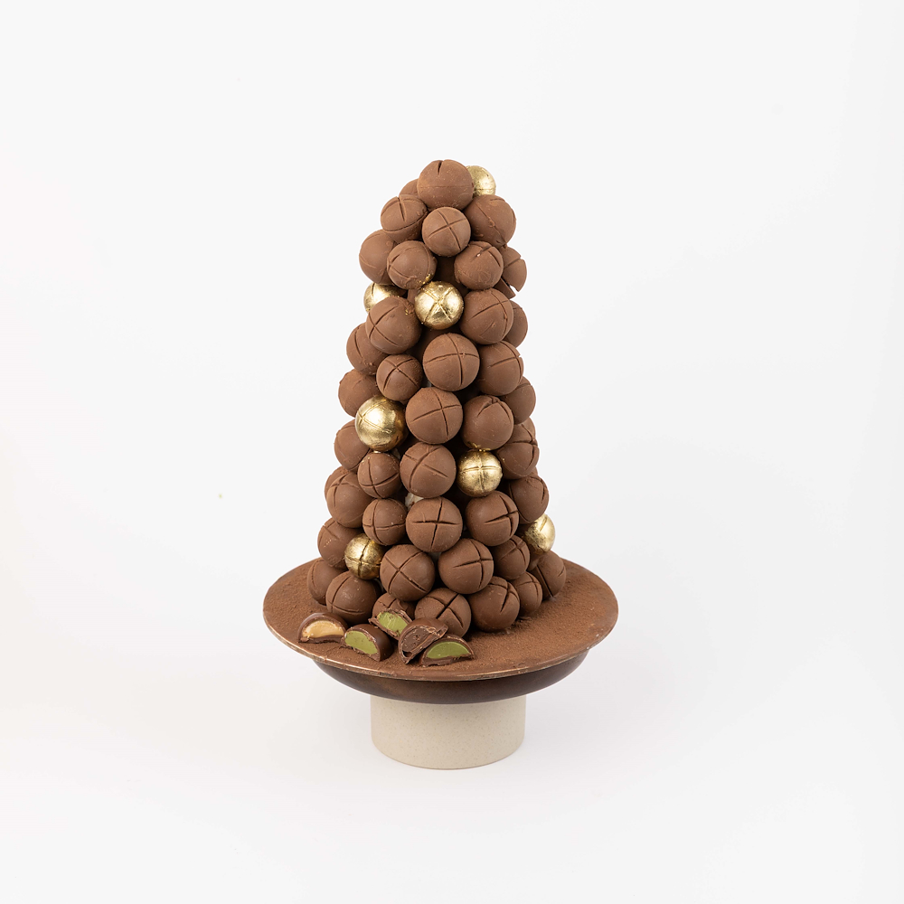 قطعة شوكولاتة بلجيكية بالحليب مصنوعة يدويا بوزن 1250غ بحشوات ترافل كريمية صالحة للاكل مطلية بالذهب ومثالية للهدايا او العروض الاحتفالية.