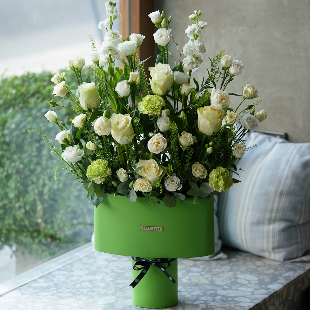 باقة فاخرة مليئة بأزهار الجوري، البيبي جوري، والكارنيشن، بداخل ستاند باللون الأخضر الفاتح.