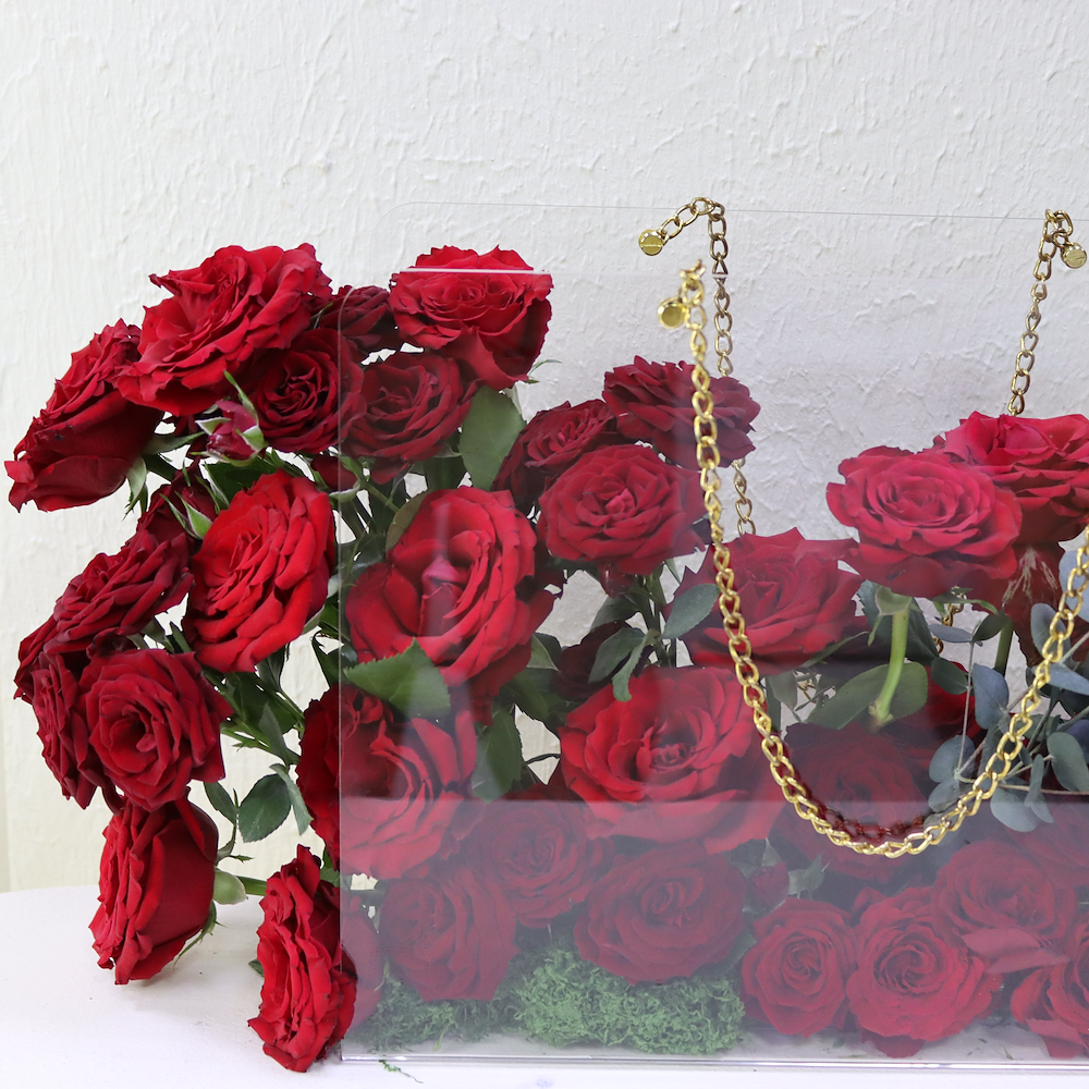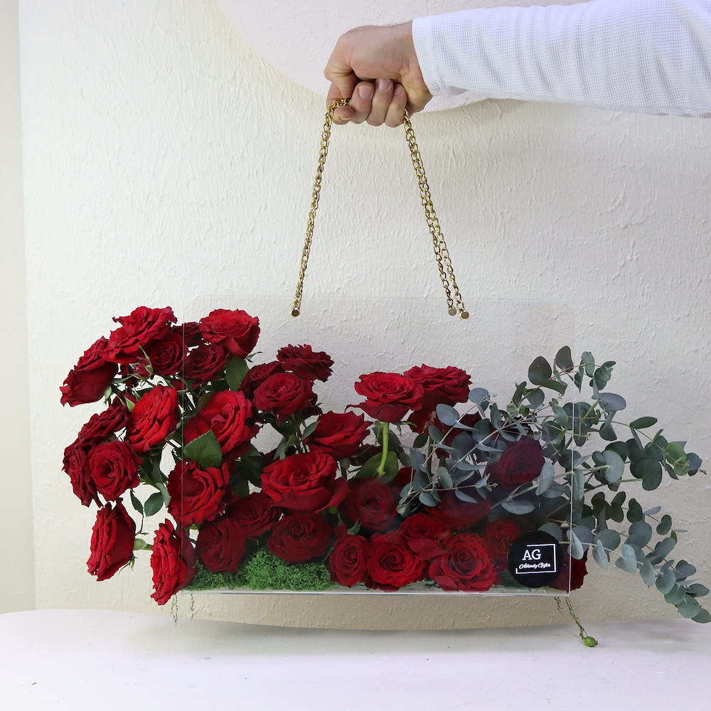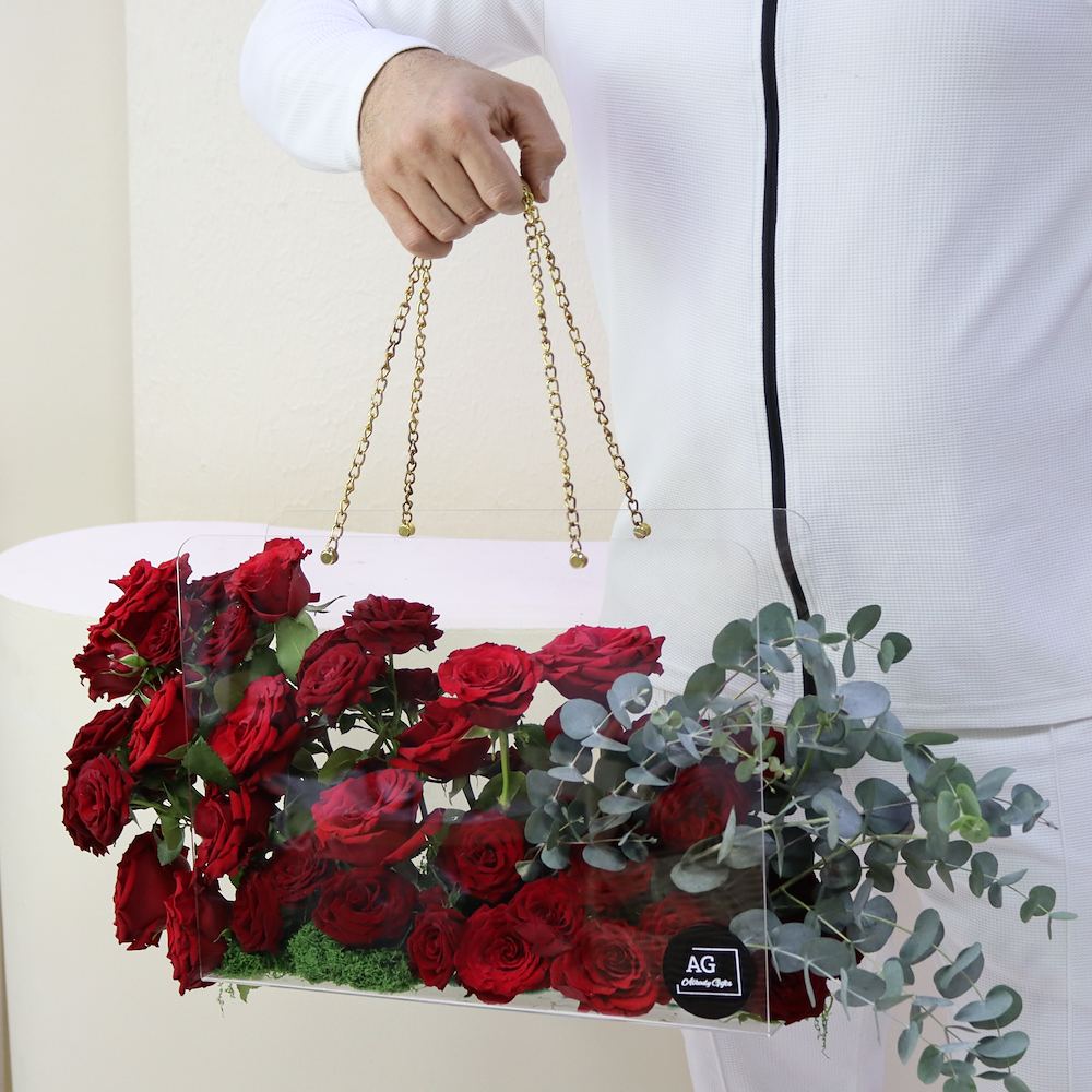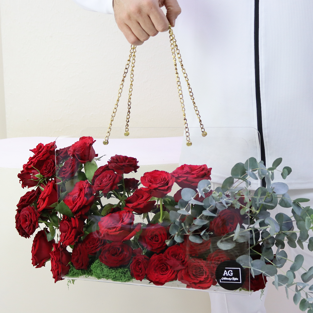 باقة زهور أنيقة في حقيبة أكريليك تضم 15 زهرة جوري حمراء، مزينة بالبيبي جوري وأغصان الأوكالبتوس الخضراء لإضفاء لمسة رقيقة ورومانسية. هدية زهور مثالية ليوم الحب، والذكرى السنوية، وأعياد الميلاد، والمناسبات الخاصة، مع خدمة التوصيل متوفرة في جميع أنحاء الإمارات العربية المتحدة.