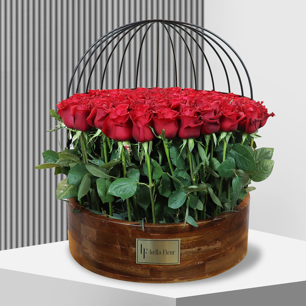 باقة خلابة من 100 زهرة جوري حمراء فاخرة، معروضة بجمال آسر في فازة أنيقة من خشب الليكوود. يبرز التصميم الخشبي الراقي جمال الجوري النابض بالحياة، ليخلق تبايناً مذهلاً يضفي فخامة وعظمة.