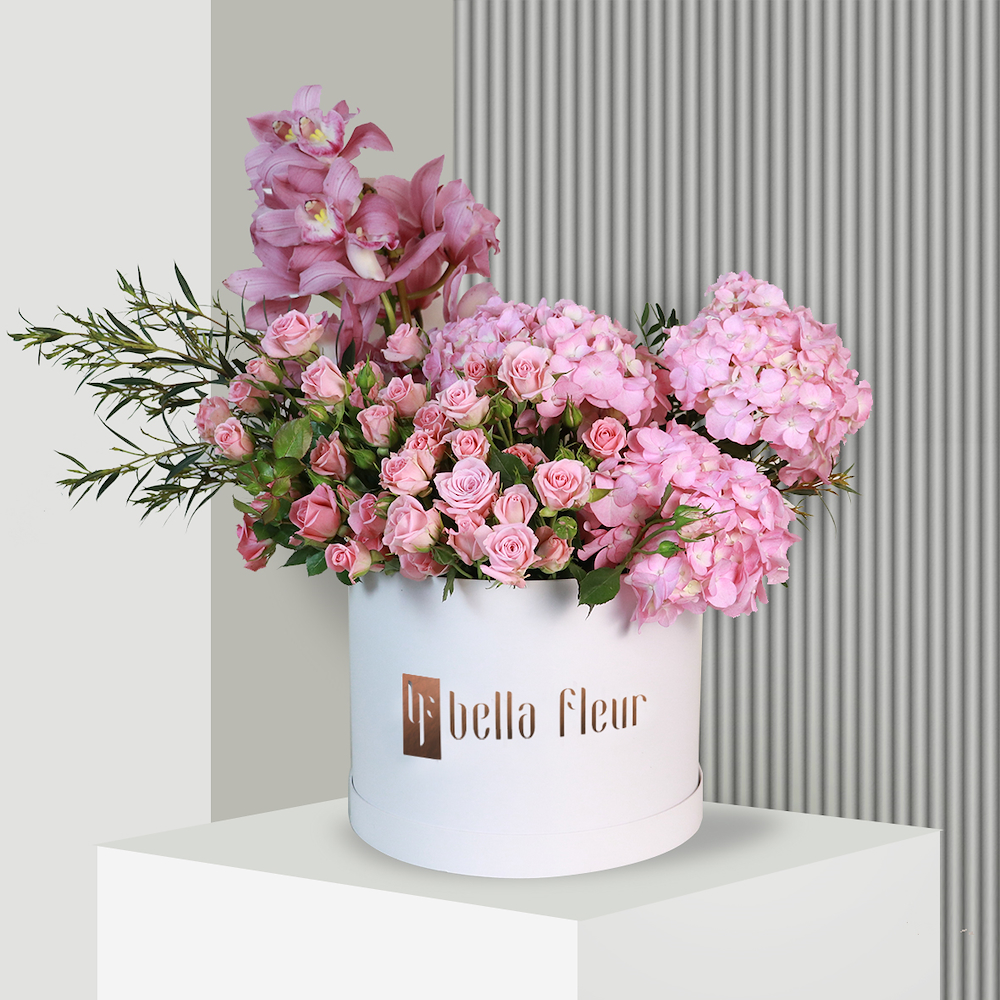 تعد الزهور الوردية وسيلة للتعبير عن الإحترام والتقدير لمن يتلقى الهدية. ويضفي هذا التنسيق مزيداً من الرقة والجمال على الباقة، إذ يتألف من زهور الجوري، الهايدرينجا والأوركيد، جميعها باللون الوردي. وتزينها لمسات من اللون الأخضر بإستخدام أوراق الشجر الخضراء النضرة.