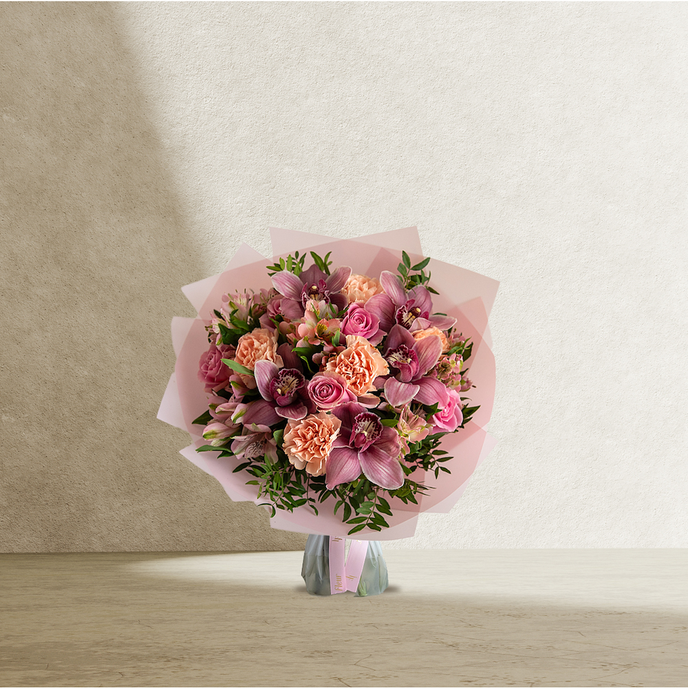 باقة يد تحتوي على زهور الجوري، الجيربيرا، السمبيديوم والألستروميريا، مرتبة بشكل جميل.