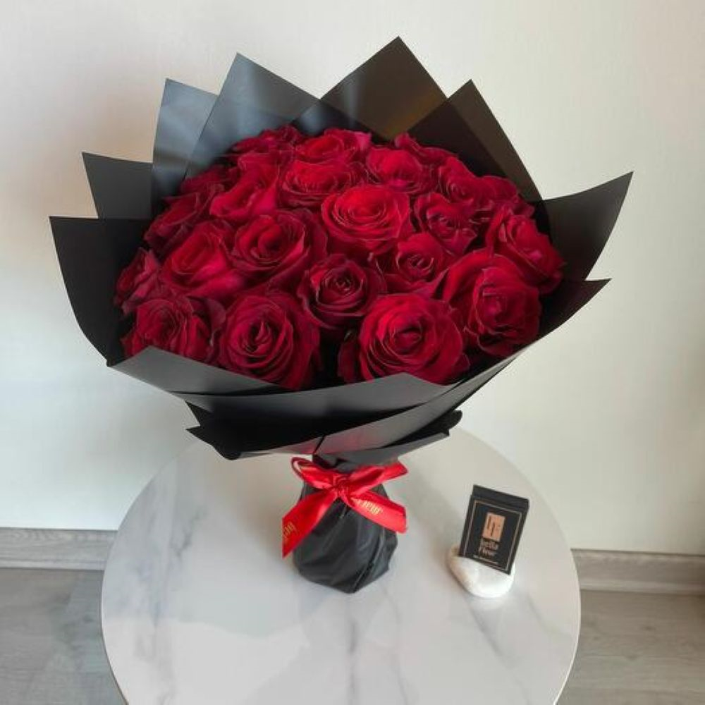 باقة أنيقة تحتوي على 24 زهرة من الجوري باللون الأحمر مع تغليف مميز.