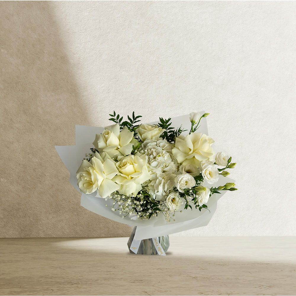باقة أنيقة من زهور الهايدرينجا، الجوري والليزيانثوس، مزينة بزهور الجيبسوفيلا الرقيقة لإطلالة ناعمة خالدة. باقة أنيقة وهادئة، تعد خياراً مثالياً للإحتفال بالذكرى السنوية، أو لتهنئة شخص ما بالشفاء العاجل، أو لمجرد إضفاء البهجة على يومه. متوفرة بأحجام صغيرة ومتوسطة، مع خدمة التوصيل في جميع أنحاء دبي والإمارات.
