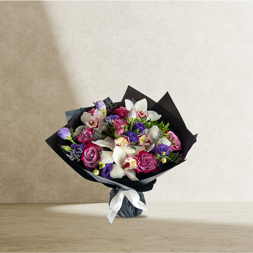 مزيج رائع من الزهور البيضاء والبنفسجية النضرة، يجمع بين زهور الجوري الرقيقة، الليزيانثوس الفاتنة، الأوركيد السيمبيديوم الساحرة. تضفي لمسات الليمونيوم الرقيقة لمسة ناعمة، لتشكل باقة زهور فاخرة مثالية لأي مناسبة خاصة. مثالية ليوم الميلاد، ذكرى الزواج، أو لمجرد إضفاء البهجة على يوم شخص ما، فهذه الباقة الجميلة تشع أناقة ورقياً. استمتع بخدمة توصيل الزهور في نفس اليوم في دبي، أو خدمة التوصيل في اليوم التالي في جميع أنحاء الإمارات.
