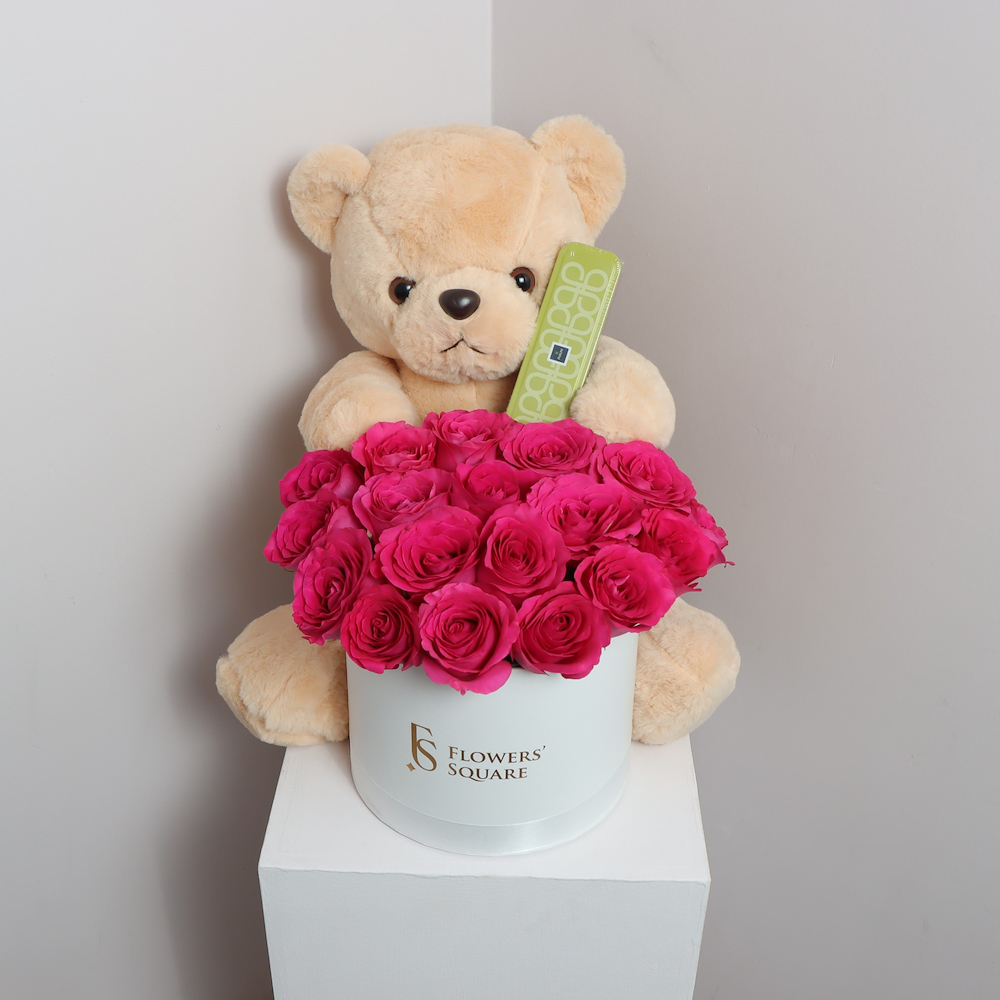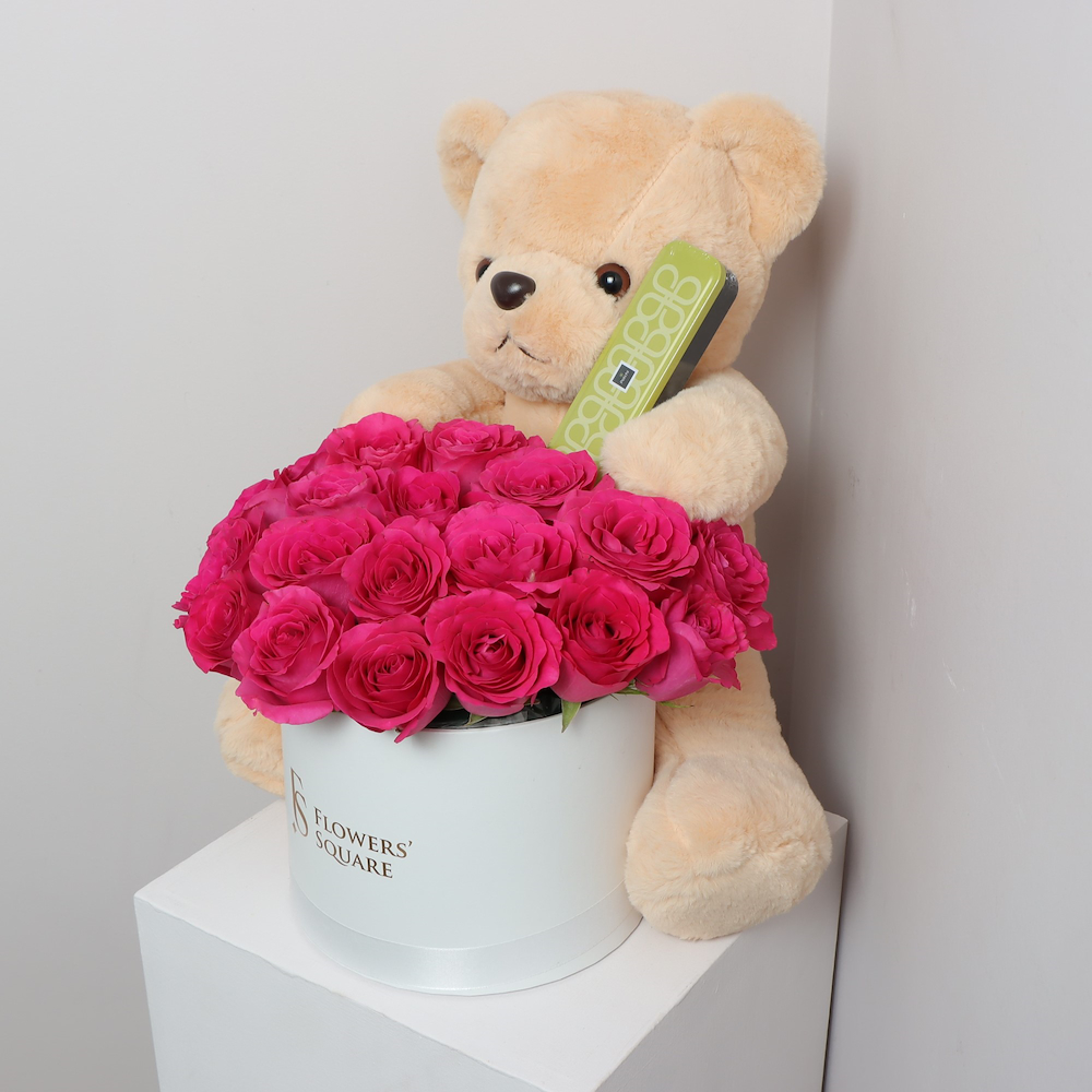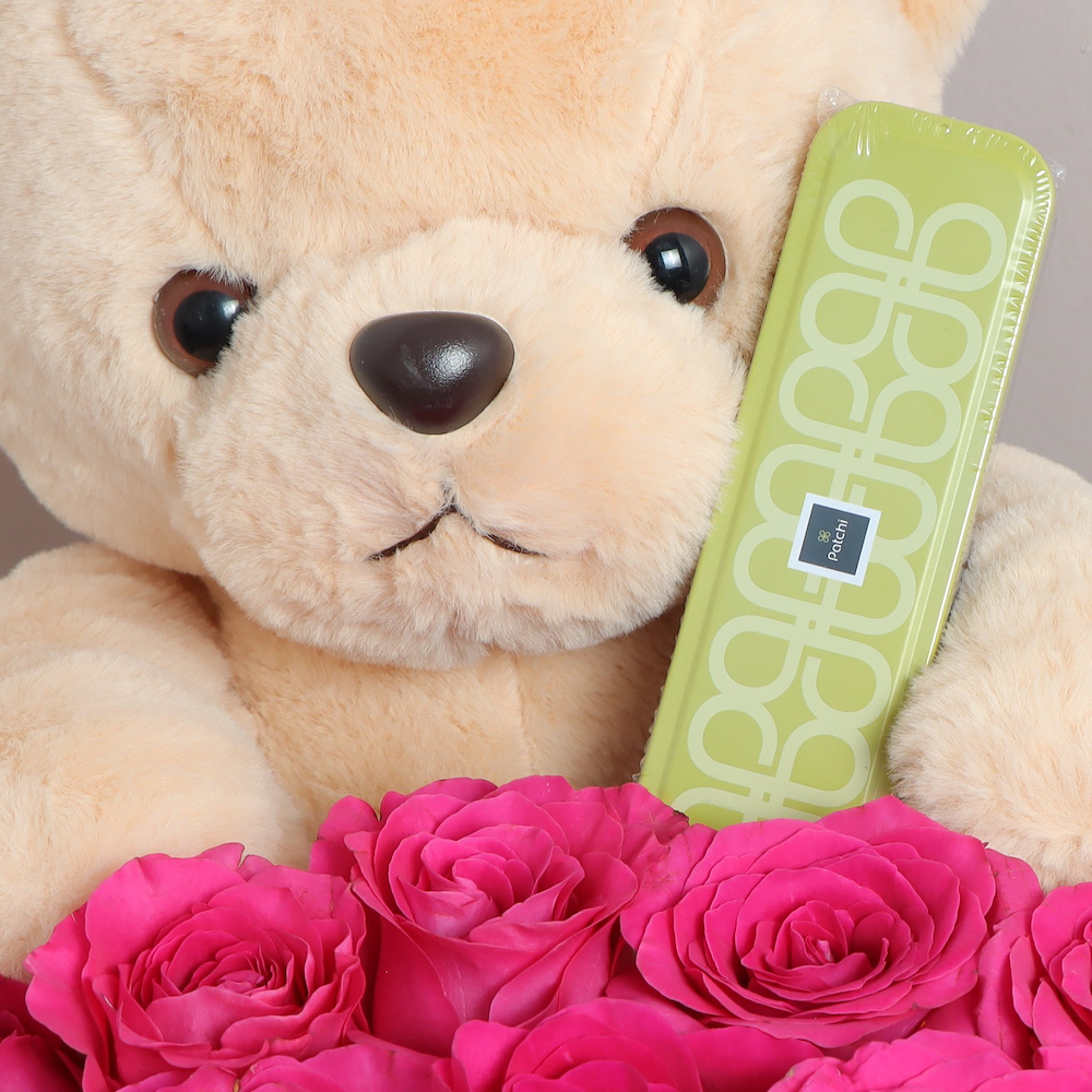 باقة تحتوي على الجوري مع دمية الدب، وشوكولاتة باتشي.
