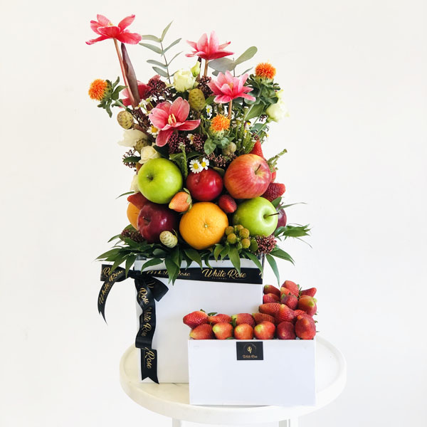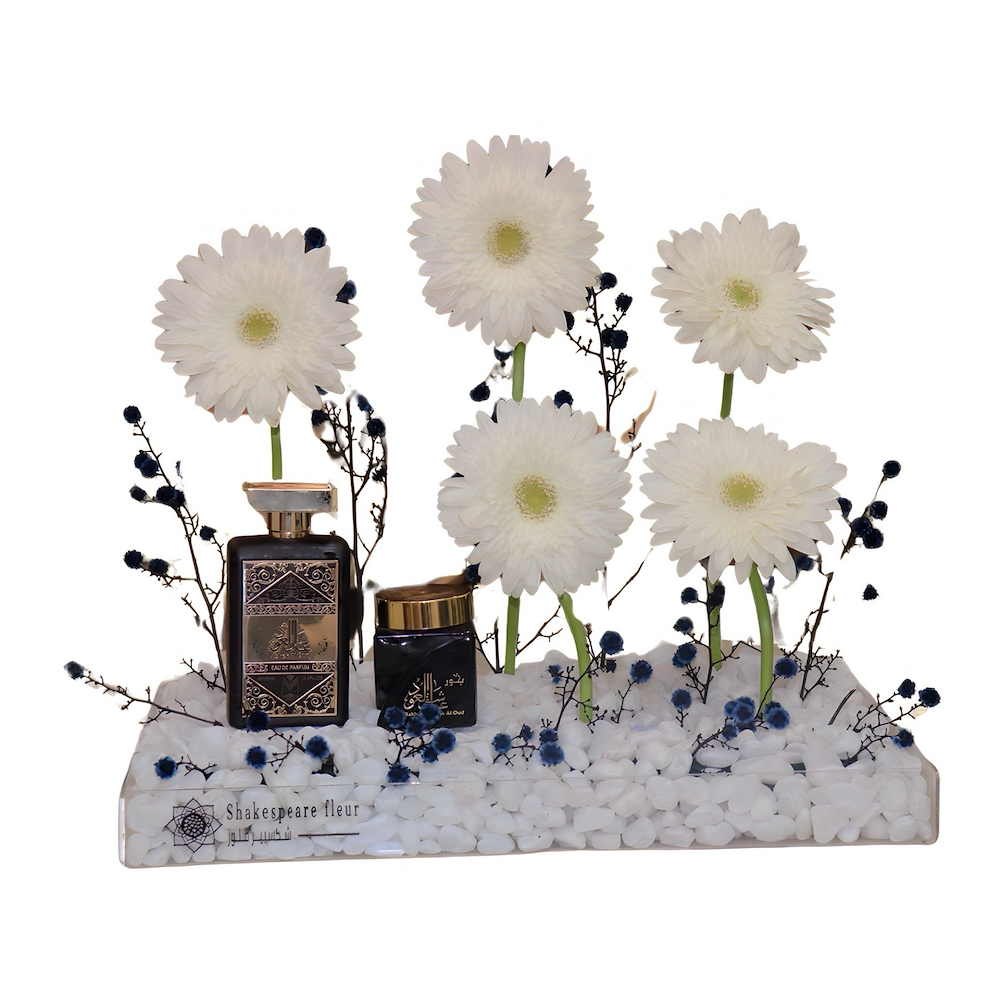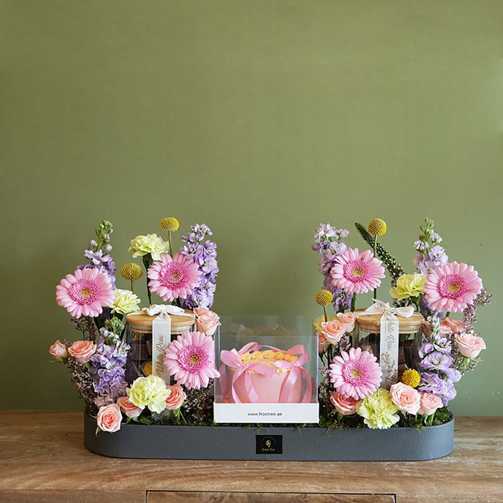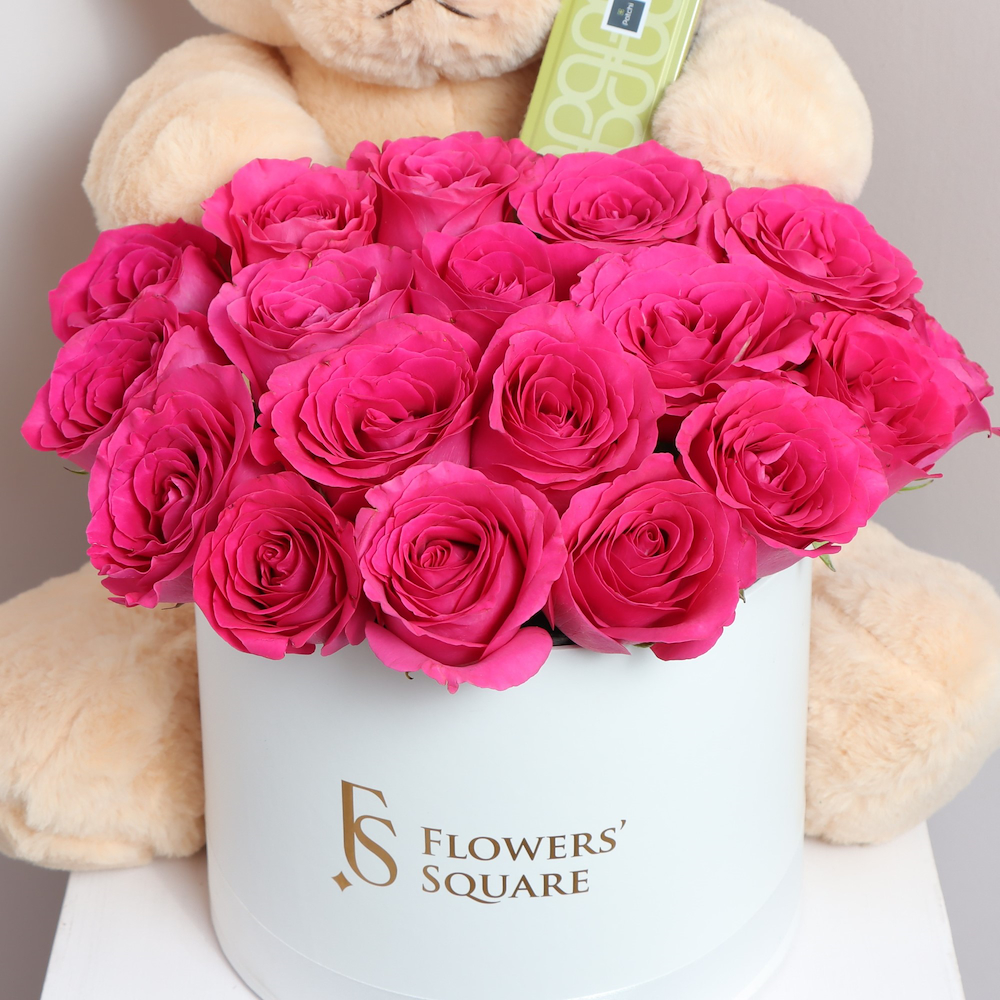 باقة تحتوي على الجوري مع دمية الدب، وشوكولاتة باتشي.
