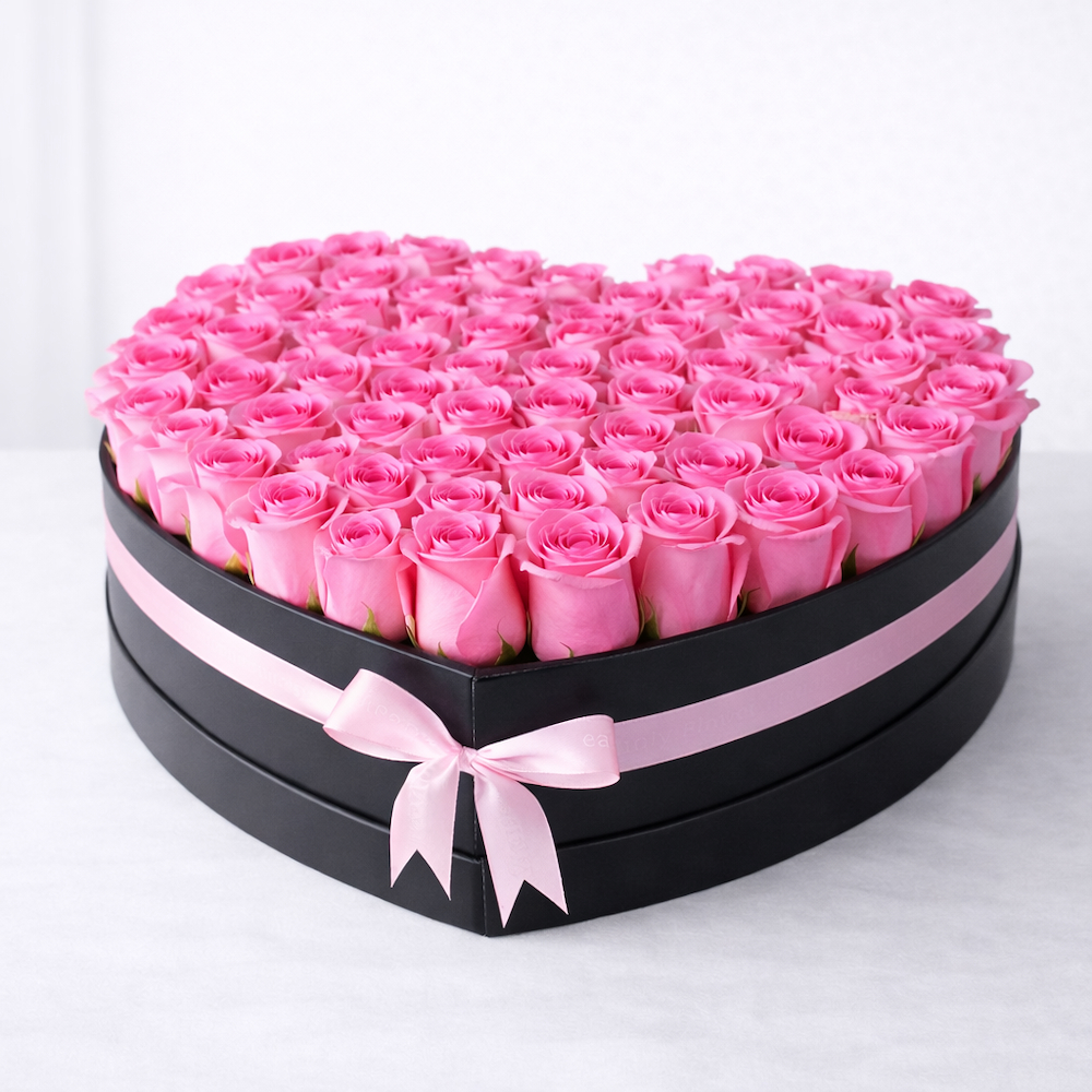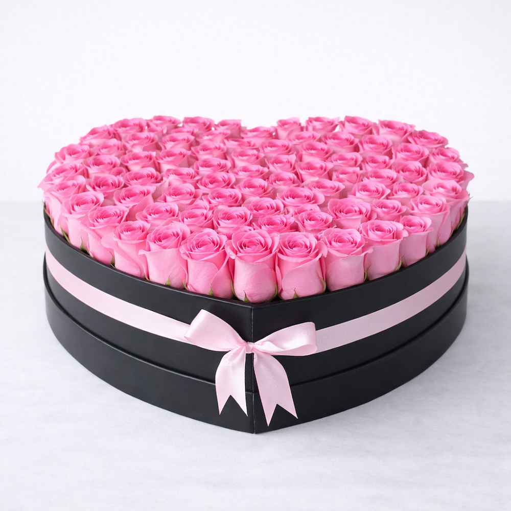 بوكس فاخر على شكل قلب يحتوي على 100 جوري وردية طبيعية، مرتبة بعناية لتعكس لمسة ناعمة ورومانسية. خيار مثالي للتعبير عن الحب والمشاعر الصادقة في المناسبات الخاصة مثل الذكرى السنوية، أعياد الميلاد، أو المفاجآت الرومانسية.