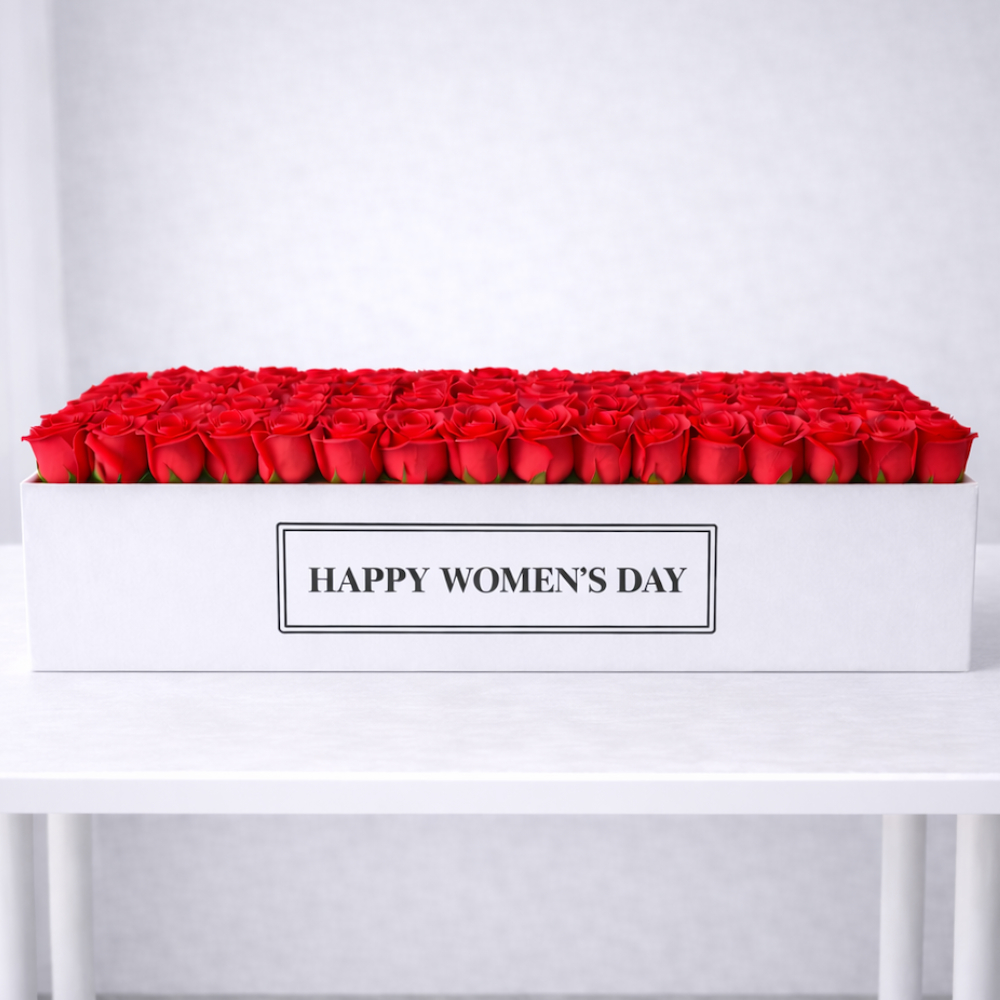بوكس أنيق يحتوي على 100 زهرة من الجوري الفاخرة باللون الأحمر.