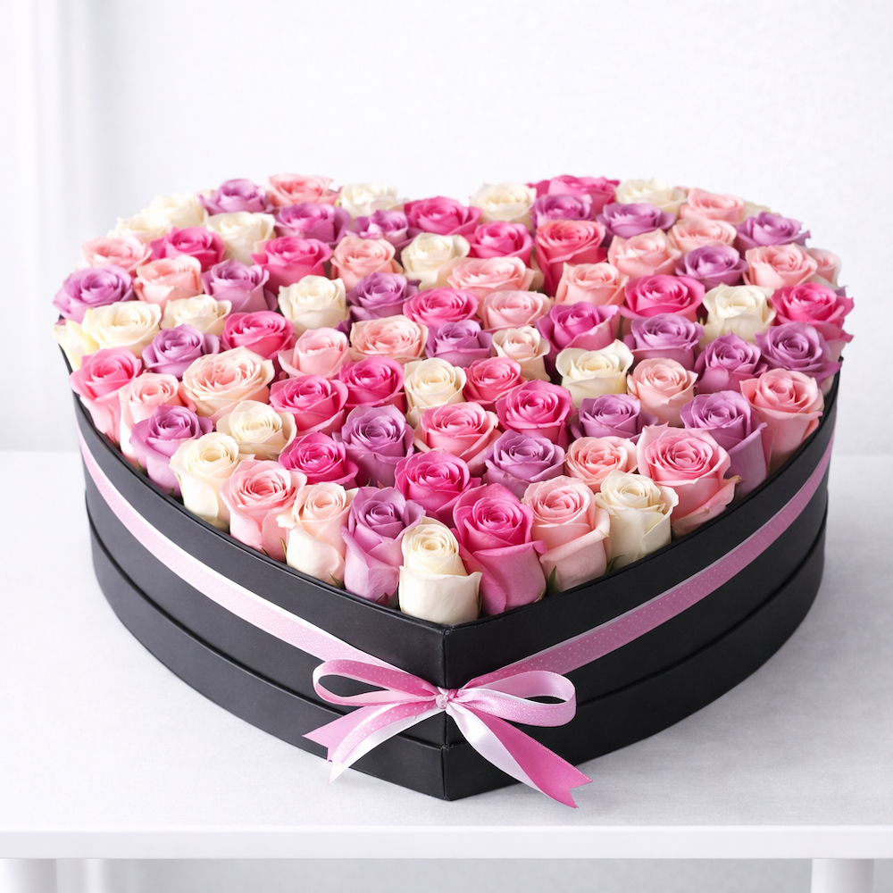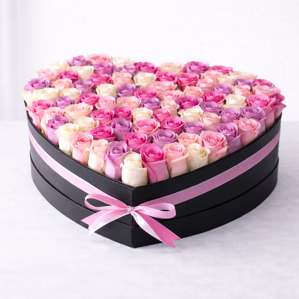 بوكس فاخر أسود على شكل قلب يحتوي على 100 جوري مشكلة بألوان ناعمة من الوردي، الأبيض، والموف الفاتح. تنسيق أنيق ورومانسي يعبر عن الحب والمشاعر الجميلة، مثالي للمناسبات الخاصة مثل الذكرى السنوية، عيد الحب، أو كهدية راقية تعبّر عن الاهتمام والتقدير.