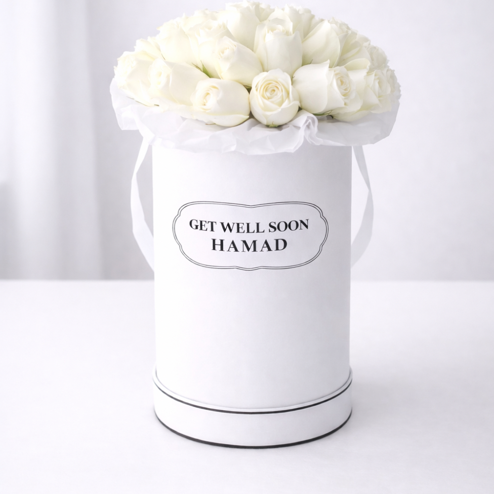 30 زهرة جوري بيضاء منسقة بعناية داخل صندوق دائري أنيق، يعكس مشاعر الإهتمام وأطيب التمنيات بالسلامة. تنسيق كلاسيكي مثالي لتقديم رسالة بأسلوب بسيط وأنيق.