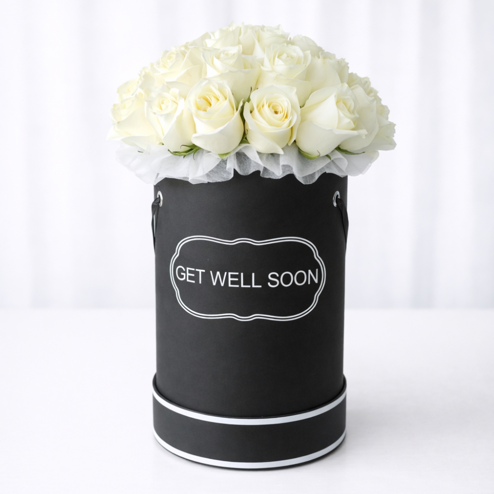 تنسيق أنيق من 30 زهرة جوري بيضاء طازجة داخل صندوق دائري أسود فاخر بتصميم مخصص. يرمز هذا الصندوق إلى النقاء والهدوء والمشاعر الصادقة، مما يجعله خياراً مثالياً للتمنيات بالشفاء، المواساة، التهاني، أو أي مناسبة خاصة. إمكانية تخصيص العبارة على الصندوق حسب الطلب.