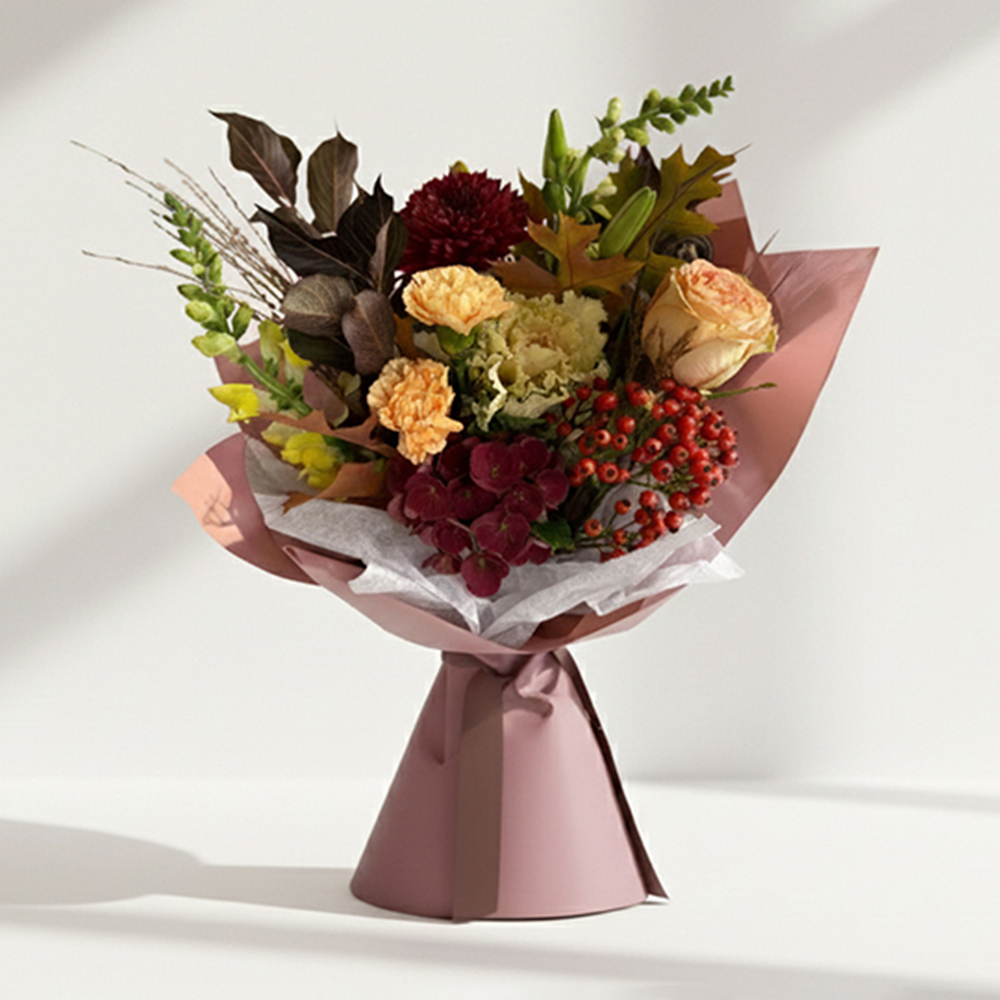باقة يد تحتوي على الجوري، الكارنيشن وغيرها.