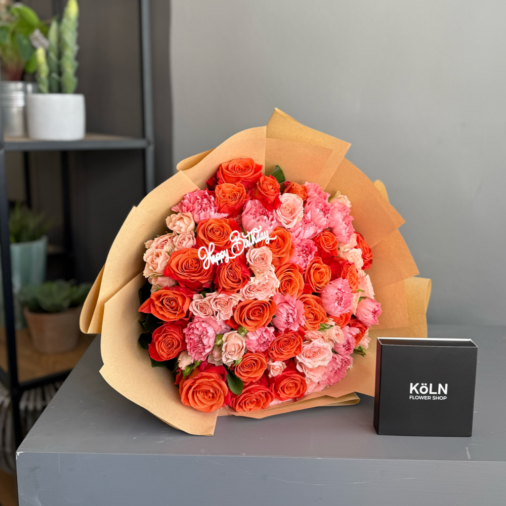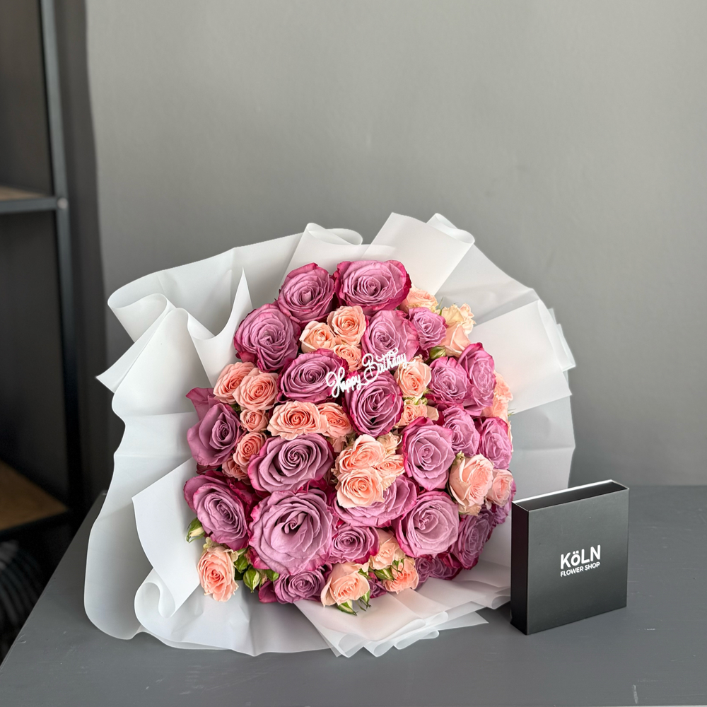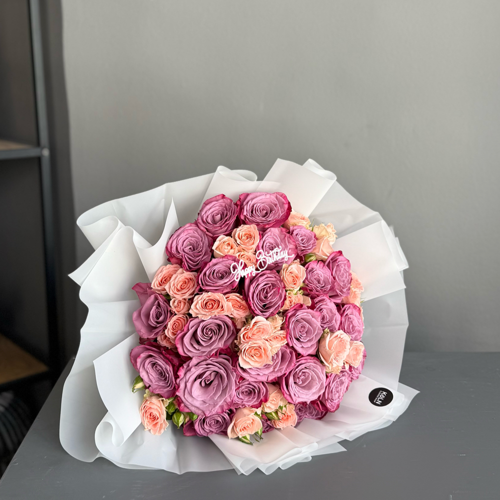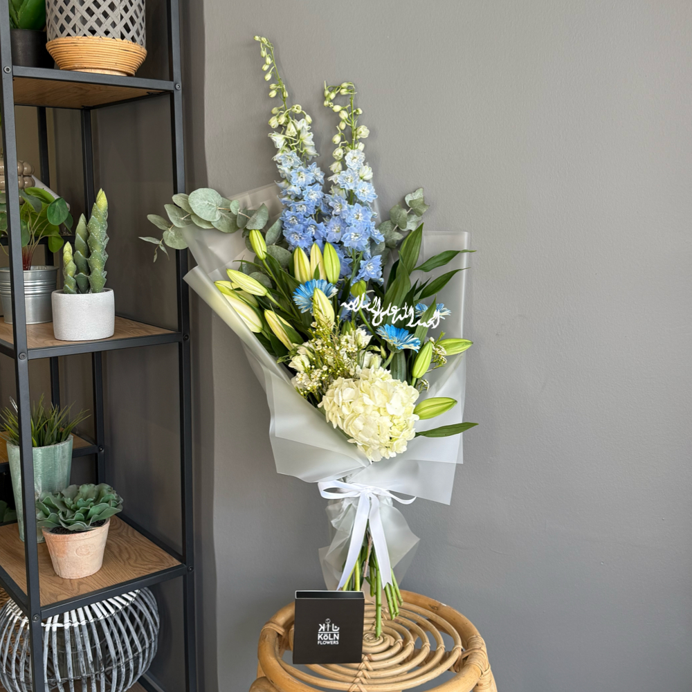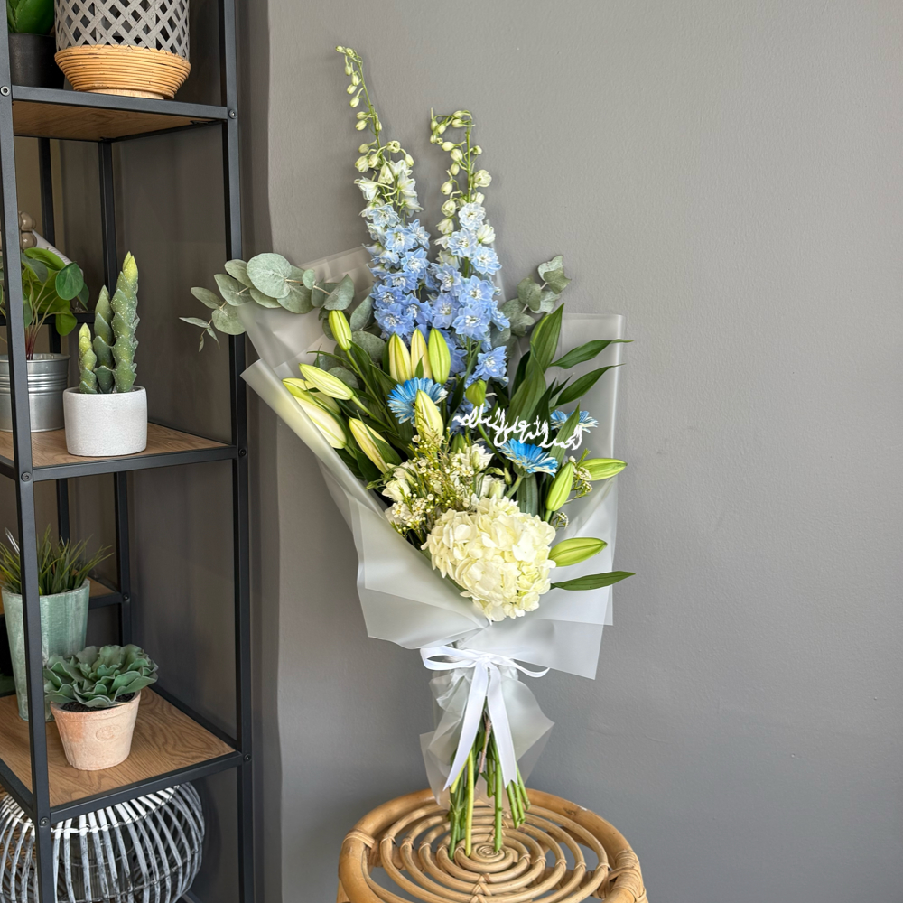 باقة يد تحتوي على زهور الدلفينيوم، الهايدرينجا، الجيربيرا، الليلي والبيبي جوري، مرتبة بشكل جميل.