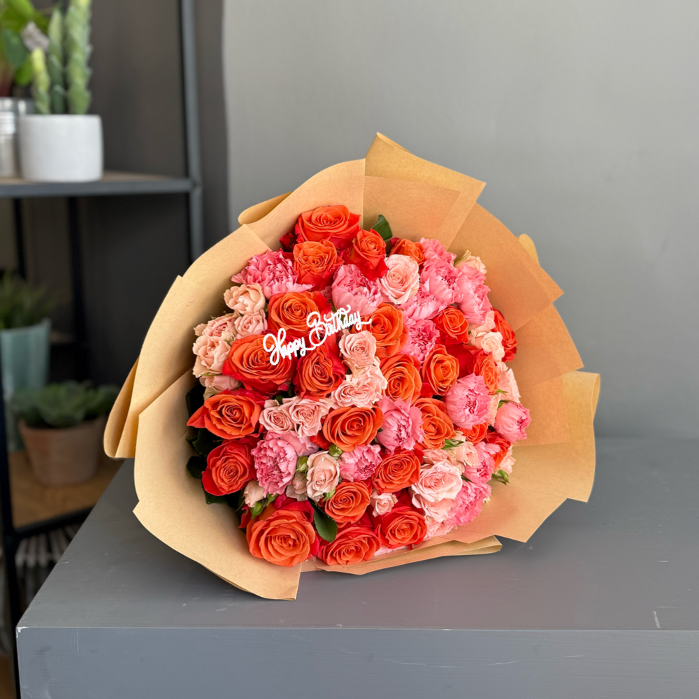 باقه يد تحتوي على زهور الجوري، البيبي جوري والكارنيشن، مرتبة بشكل جميل.
