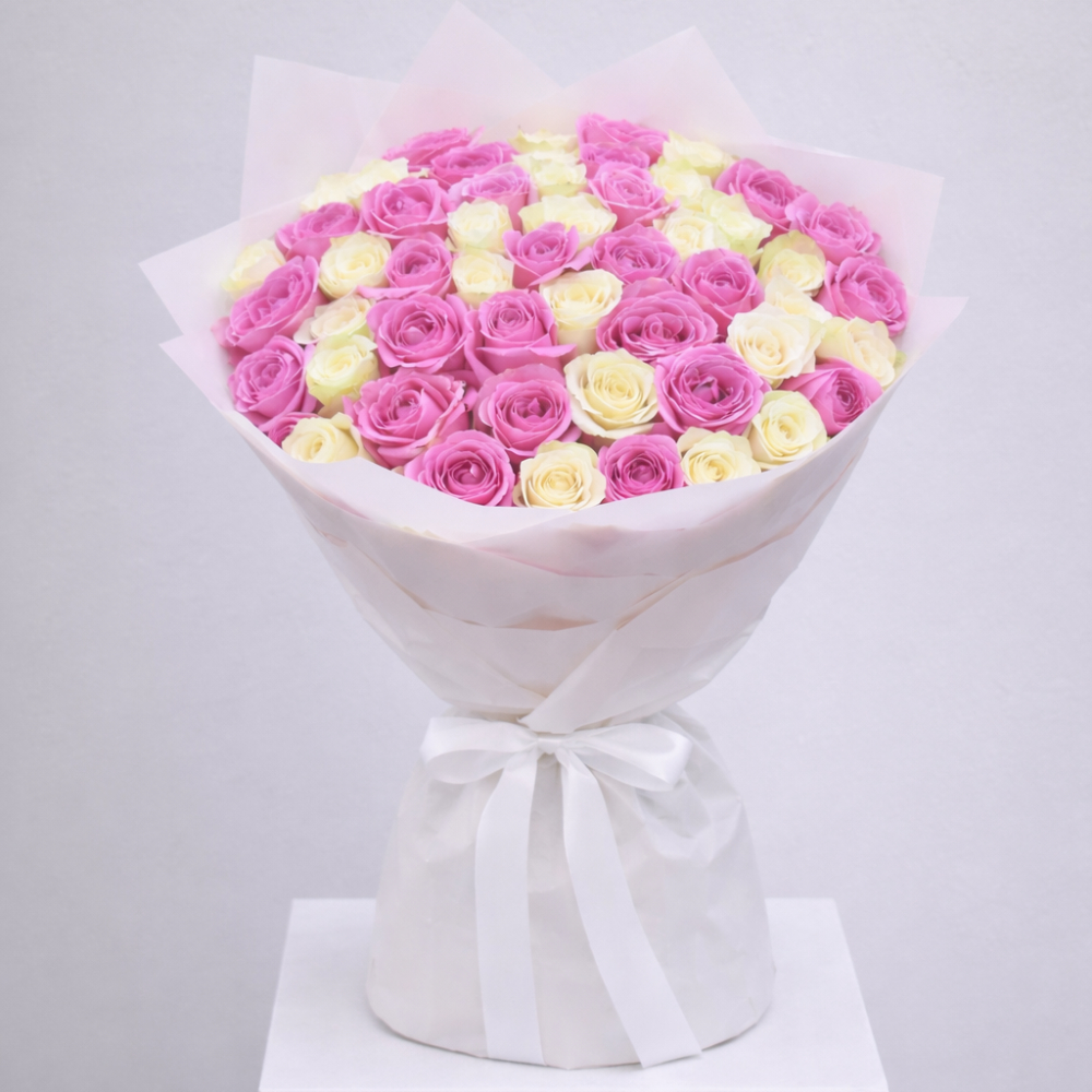 باقة يد تحتوي على 25 زهرة جوري بيضاء و26 زهرة جوري وردية، مرتبة بشكل جميل بتغليف أبيض فاخر.