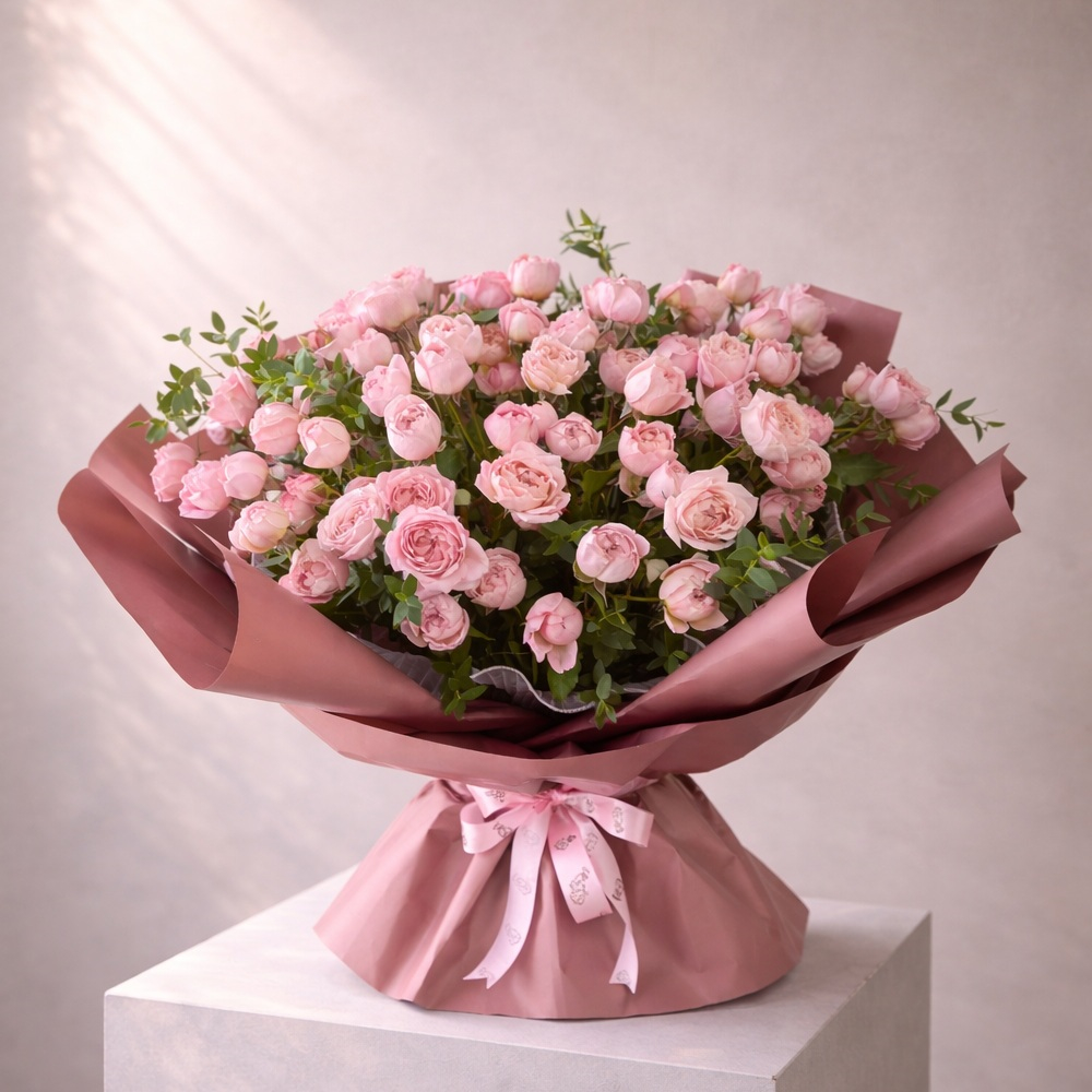 باقة فاخرة تتميز بأزهار البيبي روز الناعمة باللون الوردي مع تغليف مميز.