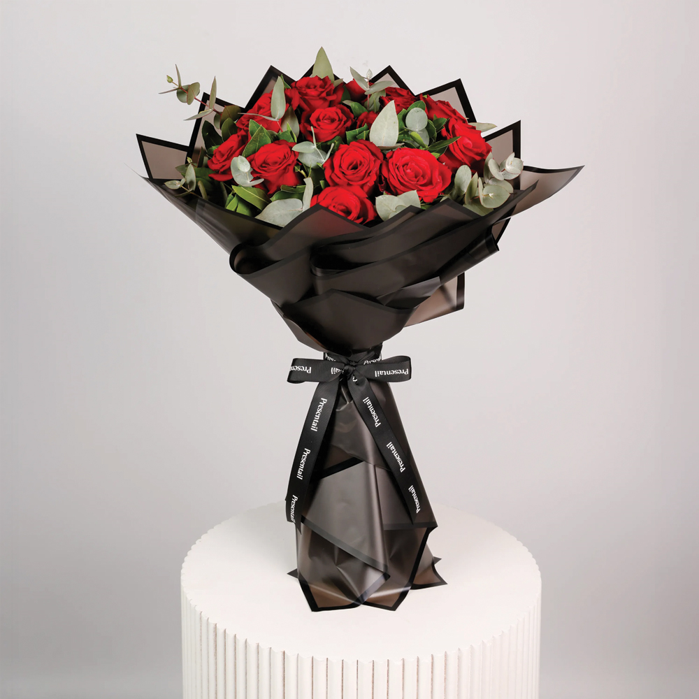 تتضمن الباقة 15 زهرة جوري حمراء وأوراق الأوكالبتوس، ملفوفة بورق أسود، مما يخلق تنسيق زهري جريئ وأنيق.