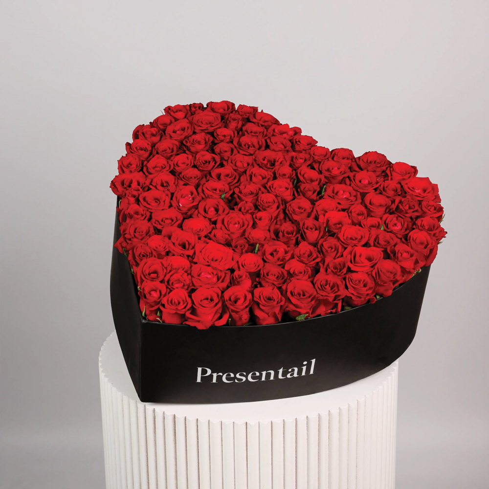 90-100 زهرة جوري حمراء، مرتبة بشكل جميل لصندوق زهور كبير ورومانسي على شكل قلب.