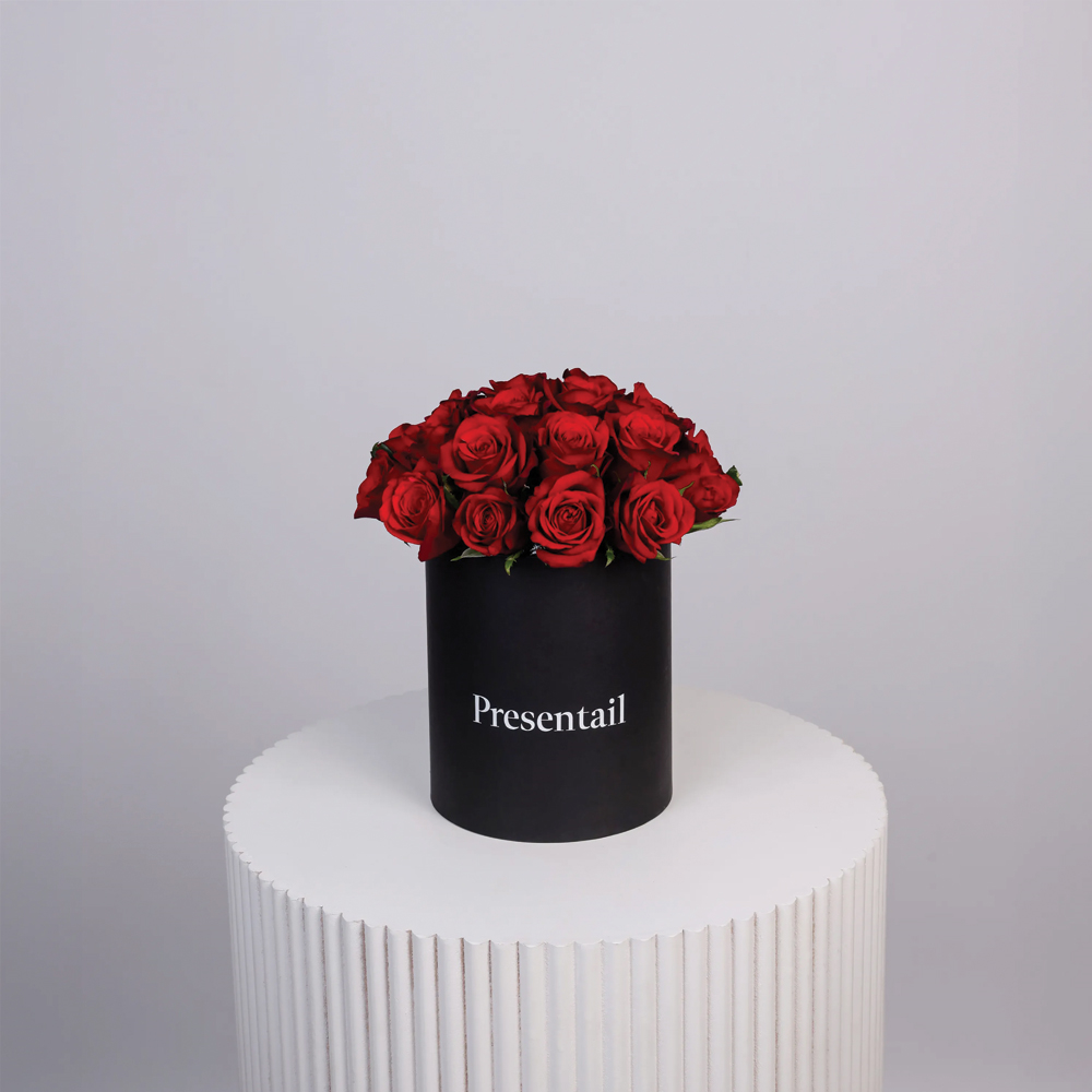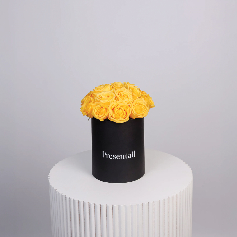 90-100 زهرة جوري صفراء اللون، مرتبة بشكل جميل لصندوق زهور كبير ورومانسي على شكل قلب.
