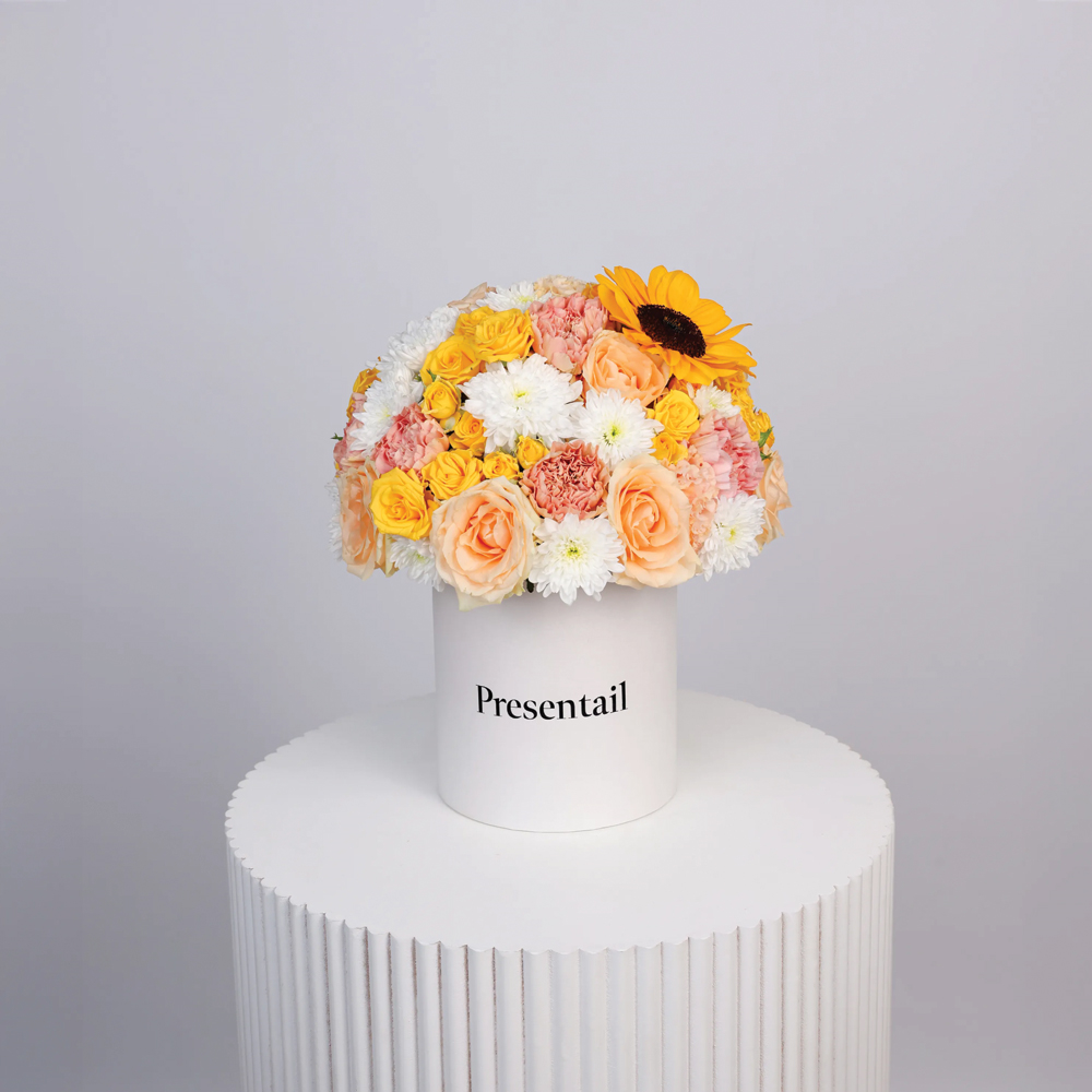 باقة تحتوي على زهور الجوري، البيبي جوري، الكارنيشن، الكريز ودوار الشمس، مرتبة بشكل جميل في صندوق أبيض.